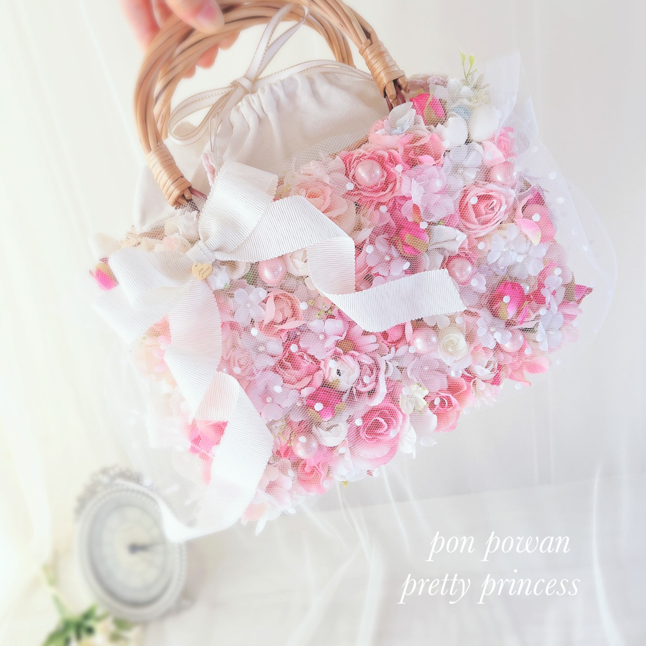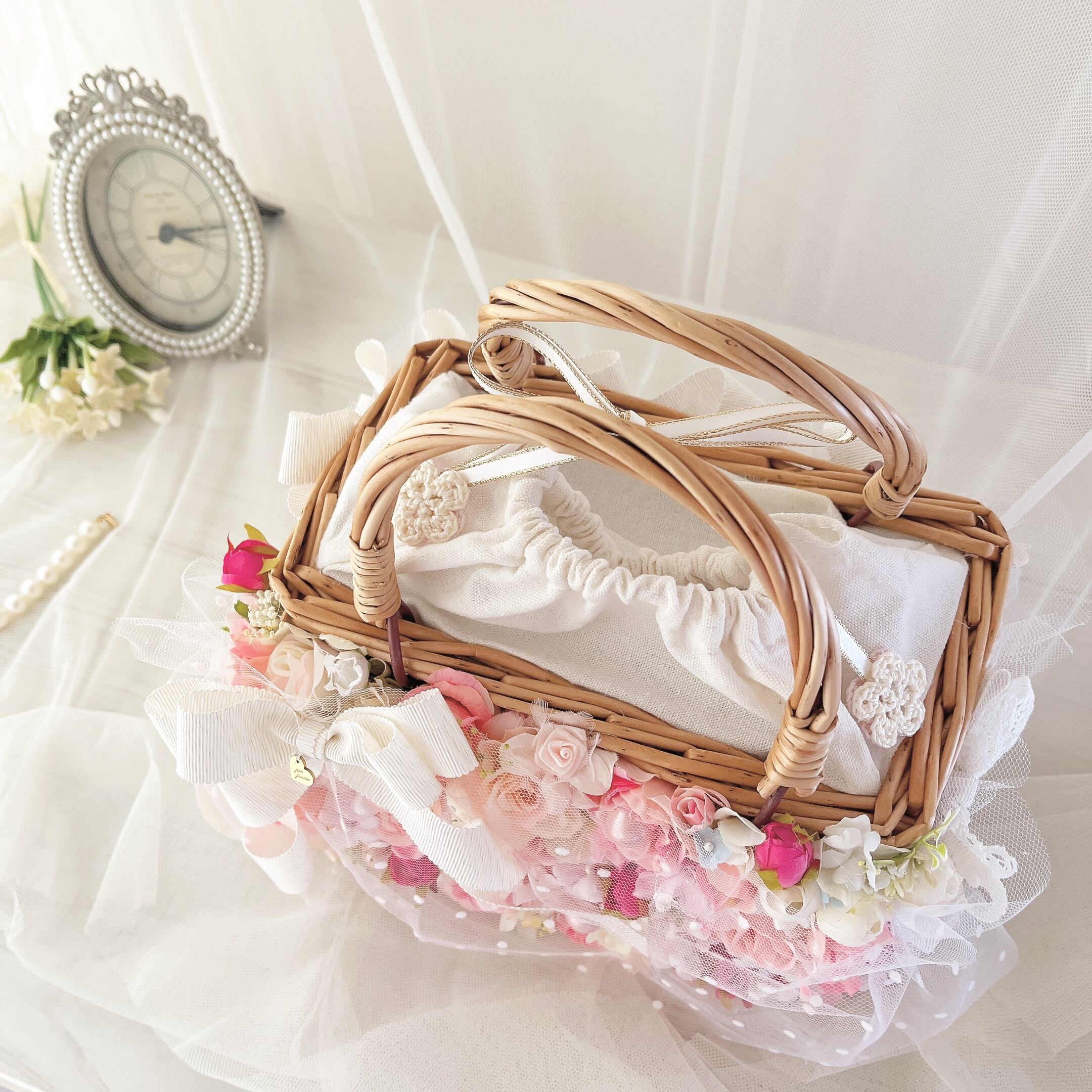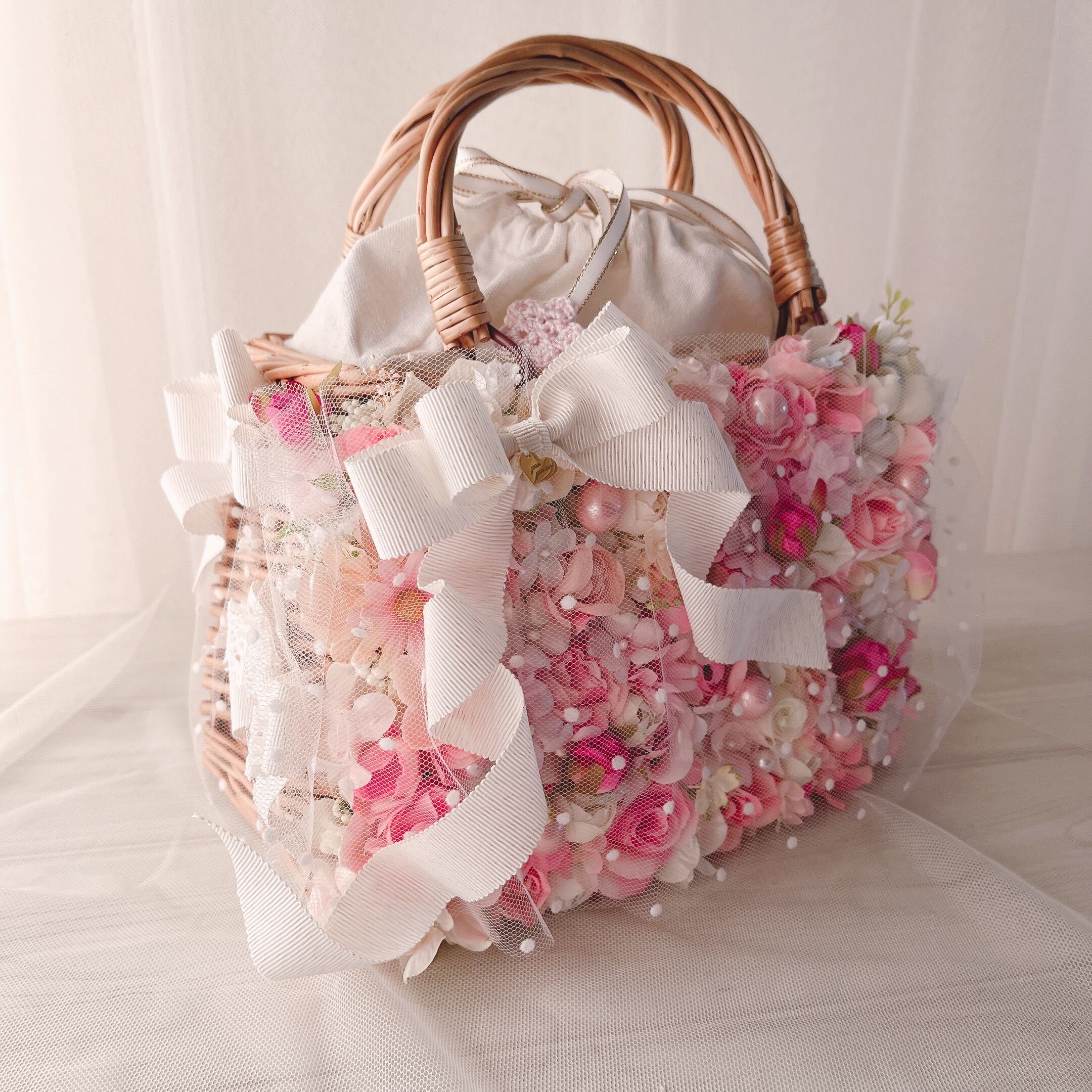 ✳︎お花とリボンのほほえみバスケット✳︎お花可愛いフラワーバスケット✳︎お花畑のようなバスケット(パールチャーム1つプレゼント♡)両面楽しめるバッグ ♡大人可愛いバスケット♡毎日持ちたい♡カゴ♡おしゃれカゴ♡お部屋のインテリア♡エレガントバスケット♡アーティフィシャルフラワーバスケット♡お花たっぷり♡ロマンティック♡私だけの一点物♡