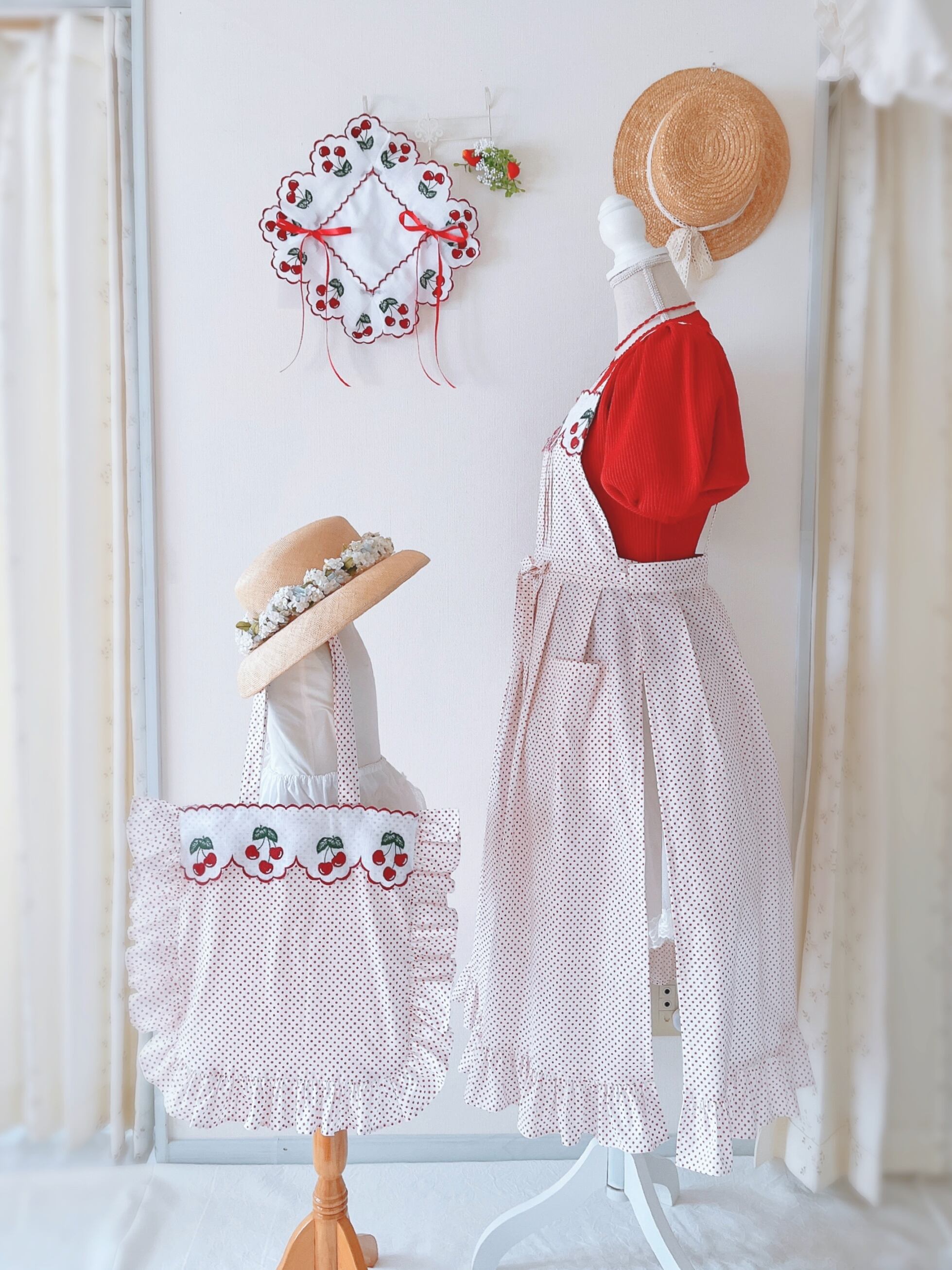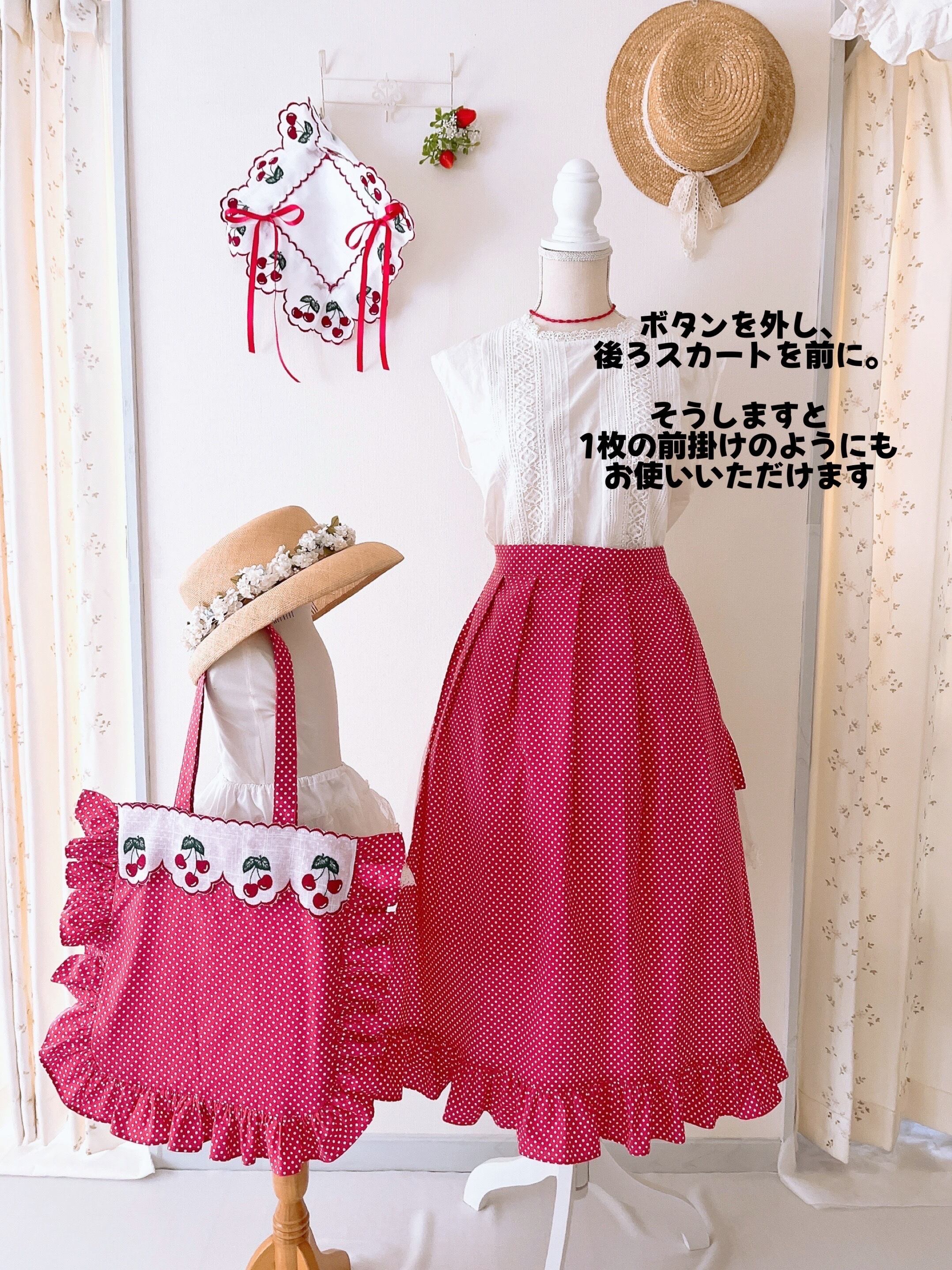 ヨーロッパ製さくらんぼレースを使用した【ときめくエプロンワンピース】単品♡ホワイト×チェリーレッド水玉柄♡可愛いシルエットのエプロン♡ピンタック入り♡さくらんぼ刺繍入りエプロン♡かわいいエプロン♡私のエプロンセット♡特別感を楽しむ♡