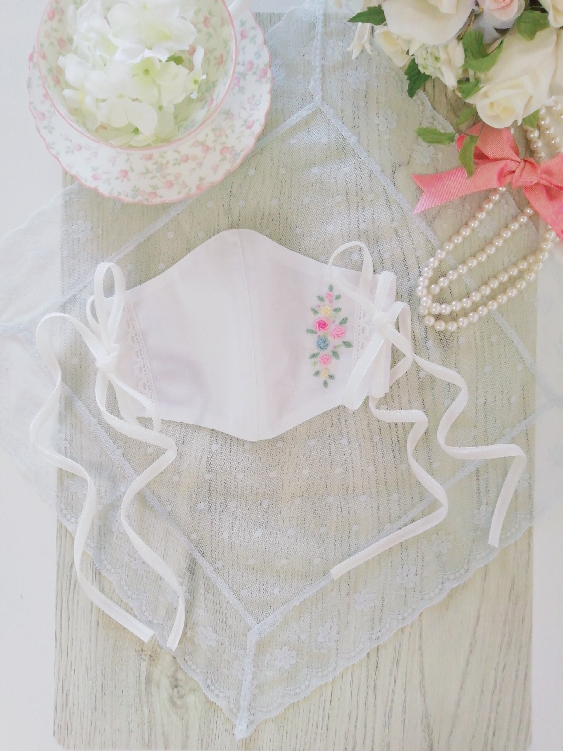 レディース【清楚なバラの刺繍の愛されマスク】White