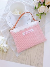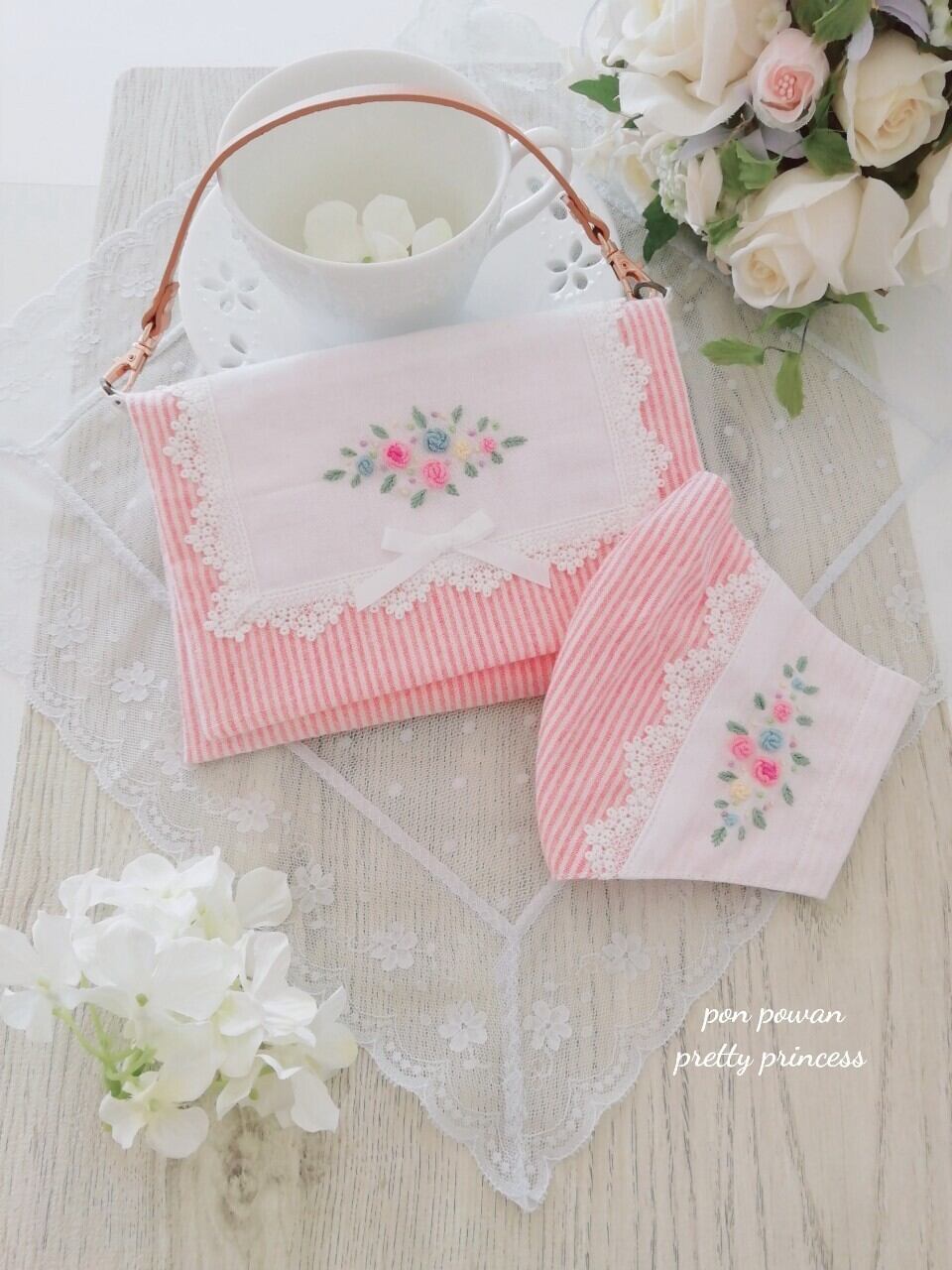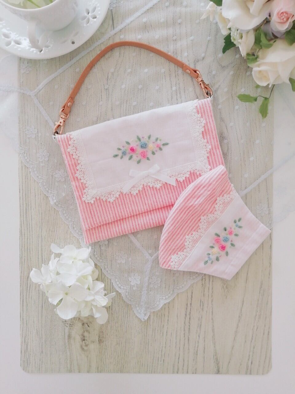 【かわいいバラの刺繍ミニポーチ(マスクケース・マクス仮置き)】ピンク