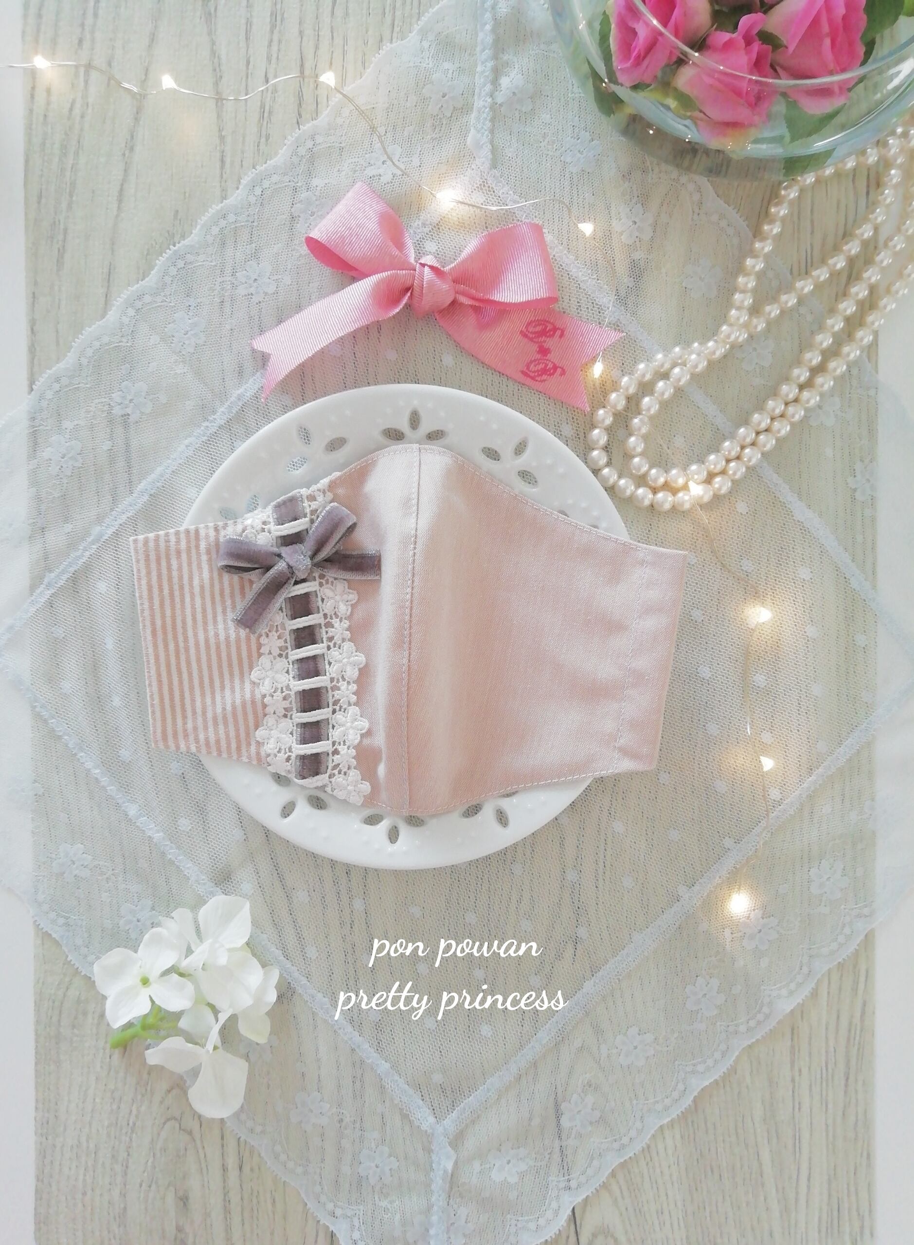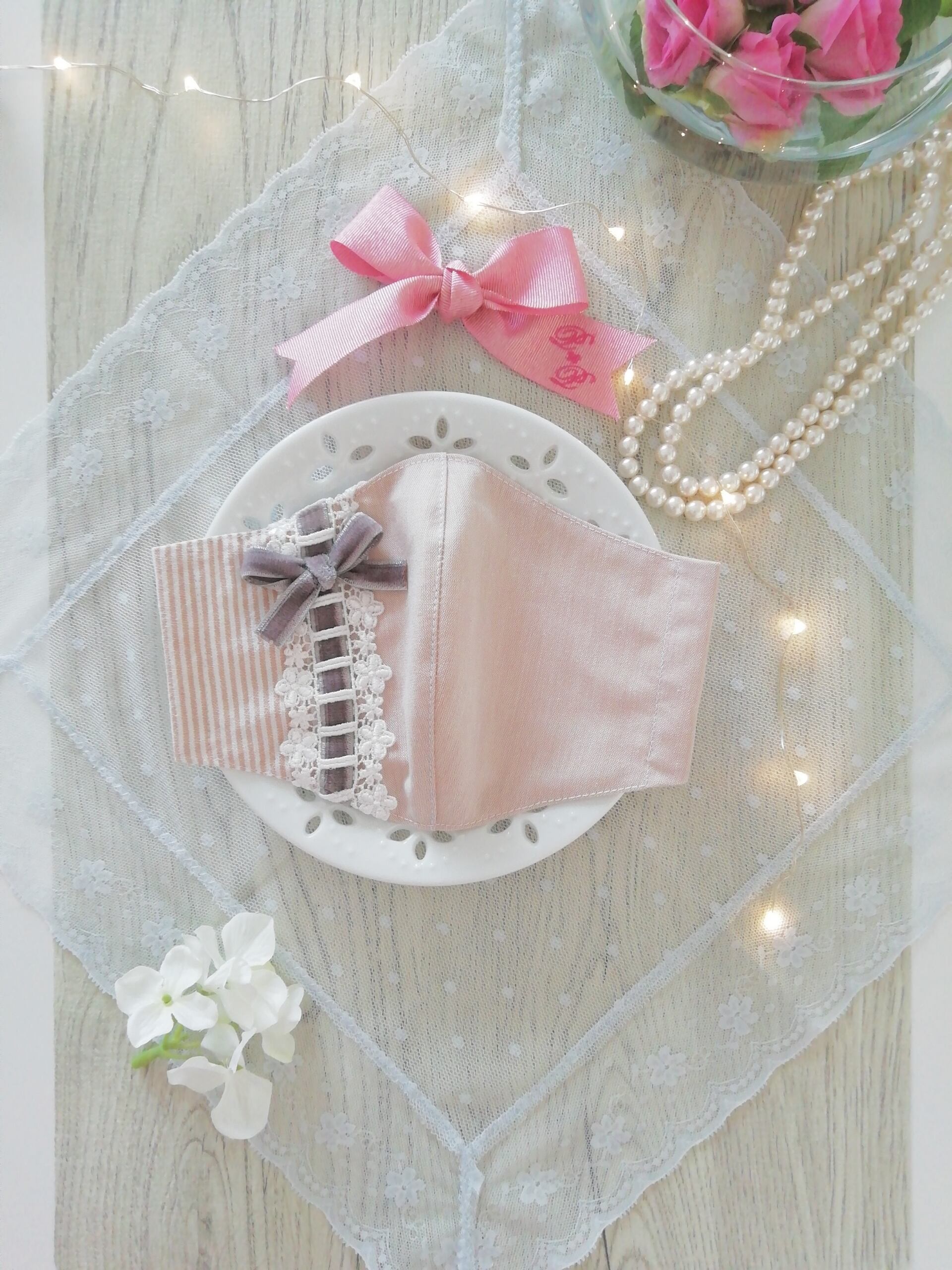 『ベルベットリボンマスク』ベージュ×細目ストラップ×グレー別珍リボン♡レディースMサイズ
