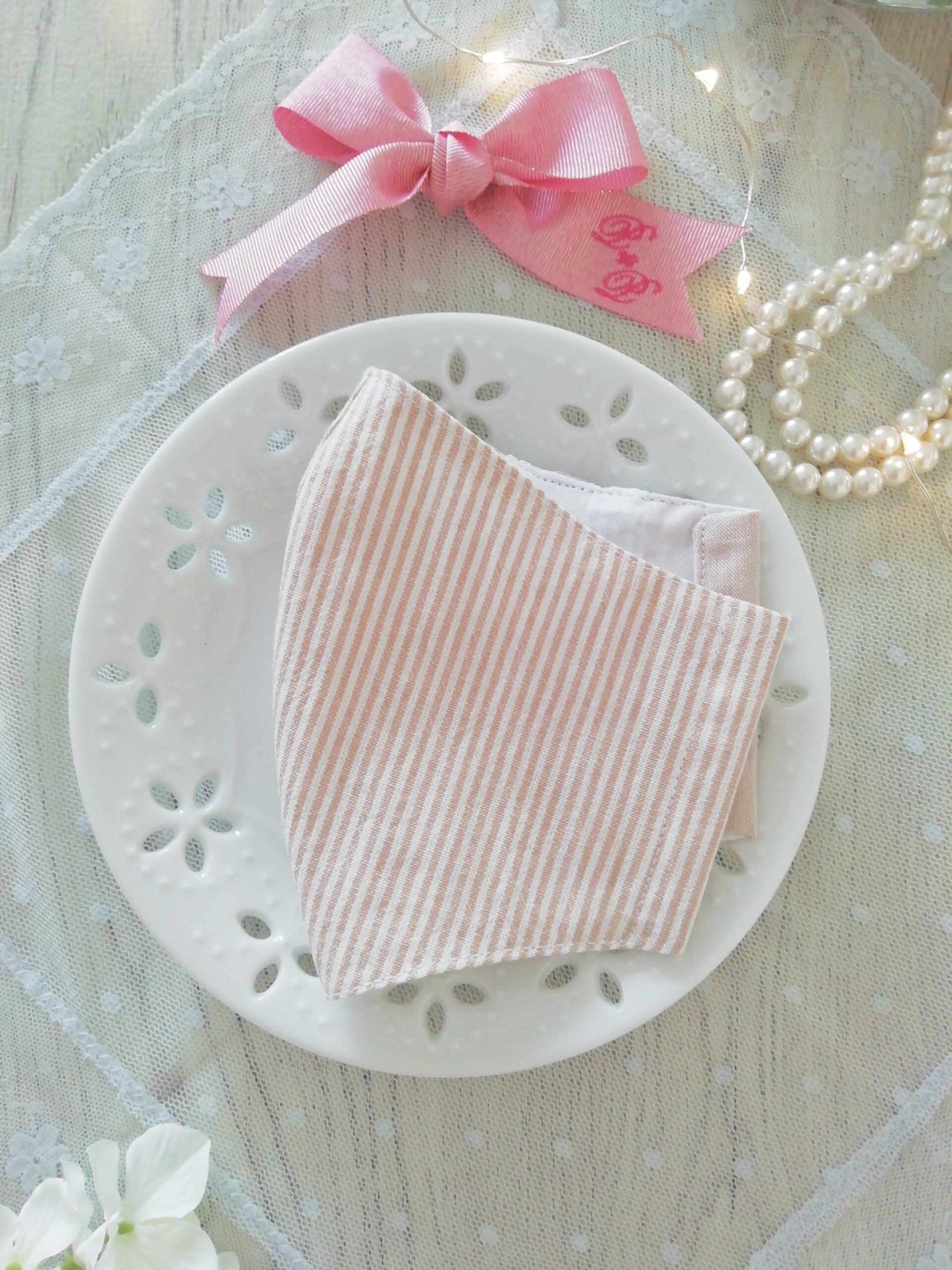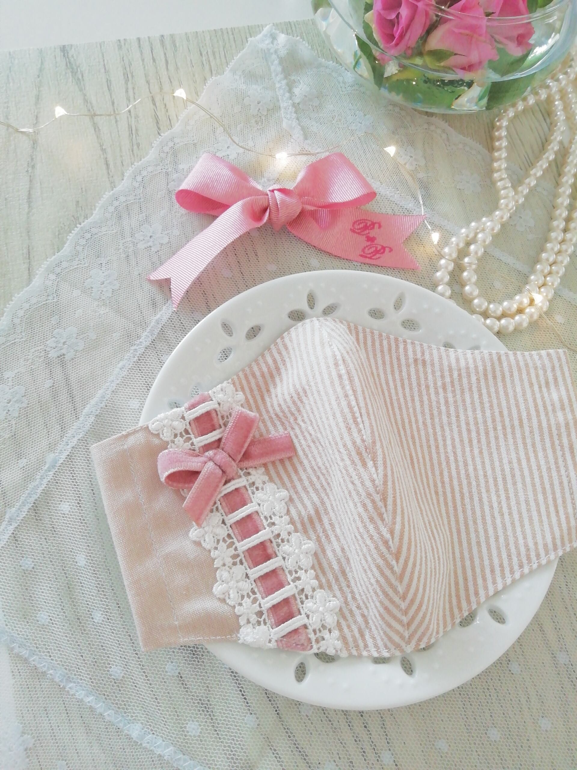 『ベルベットリボンマスク』細目ストラップ×ベージュ×くすみピンク別珍リボン♡レディースMサイズ