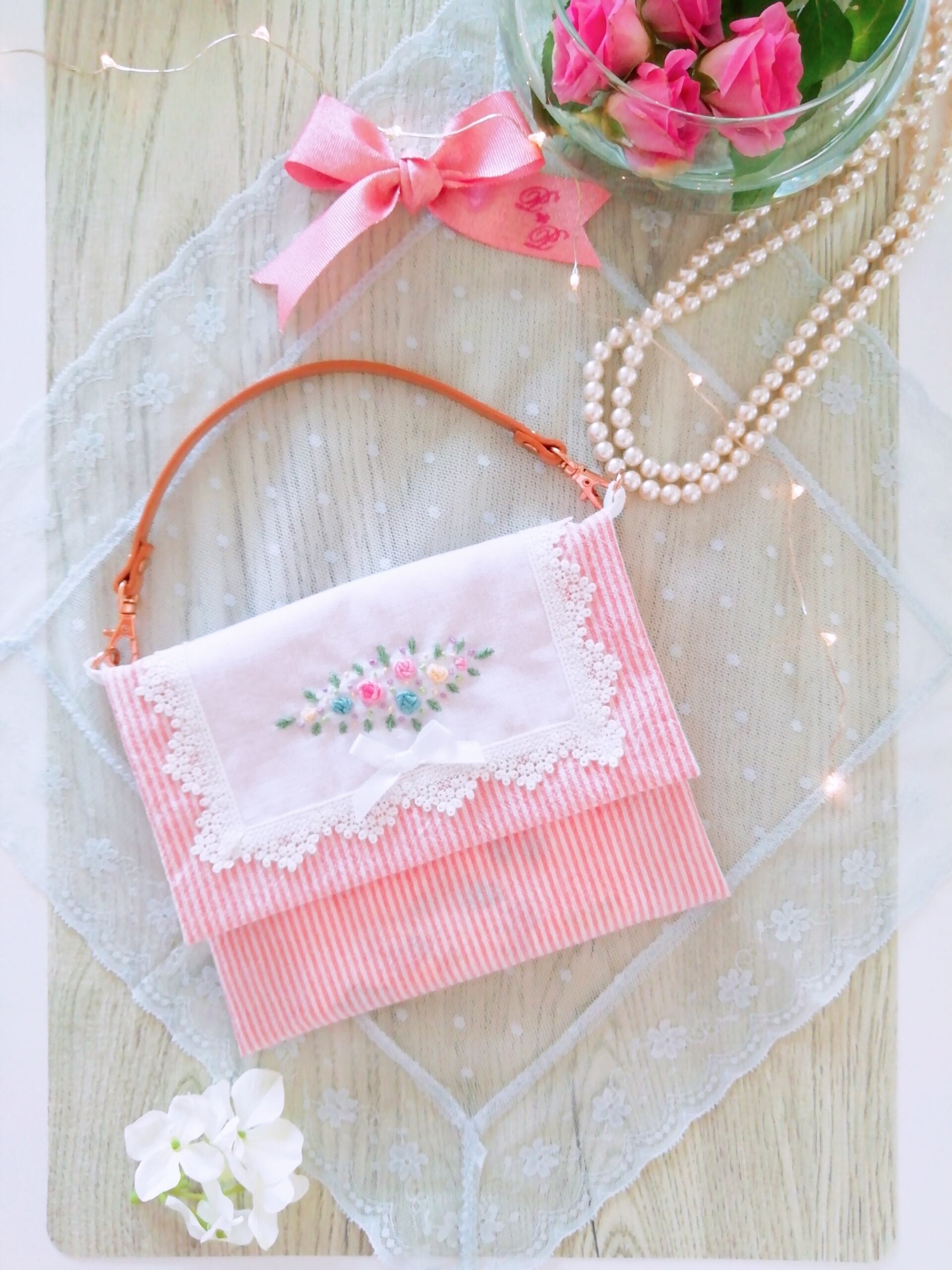 【かわいいバラの刺繍ミニポーチ(マスクケース・マクス仮置き)】ピンク
