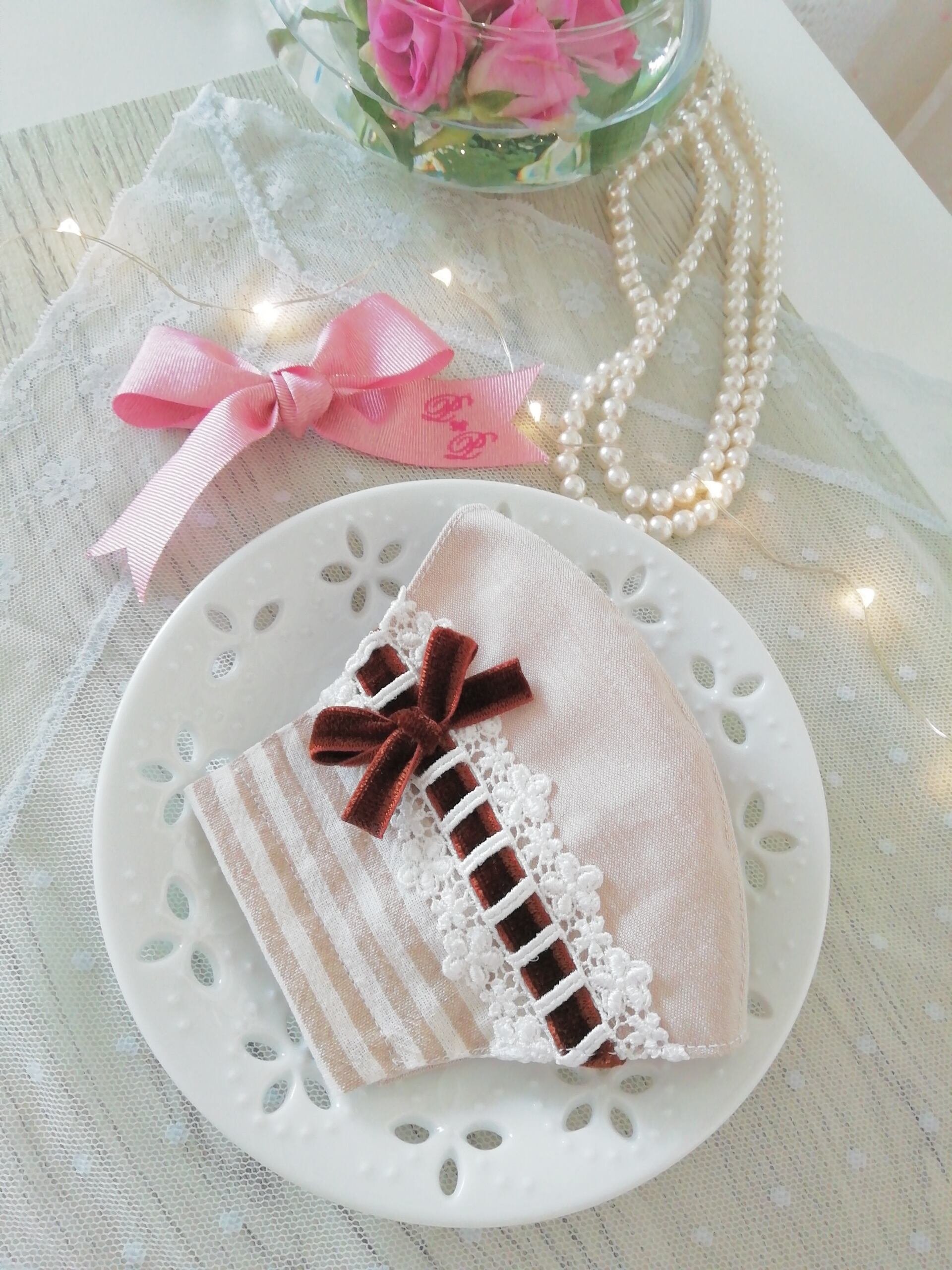 ♡happydollときめきマスクセット『nikoriちゃん&おそろいのマスク』ベージュ×太目ストラップ×茶色別珍リボン♡レディースMサイズマスク