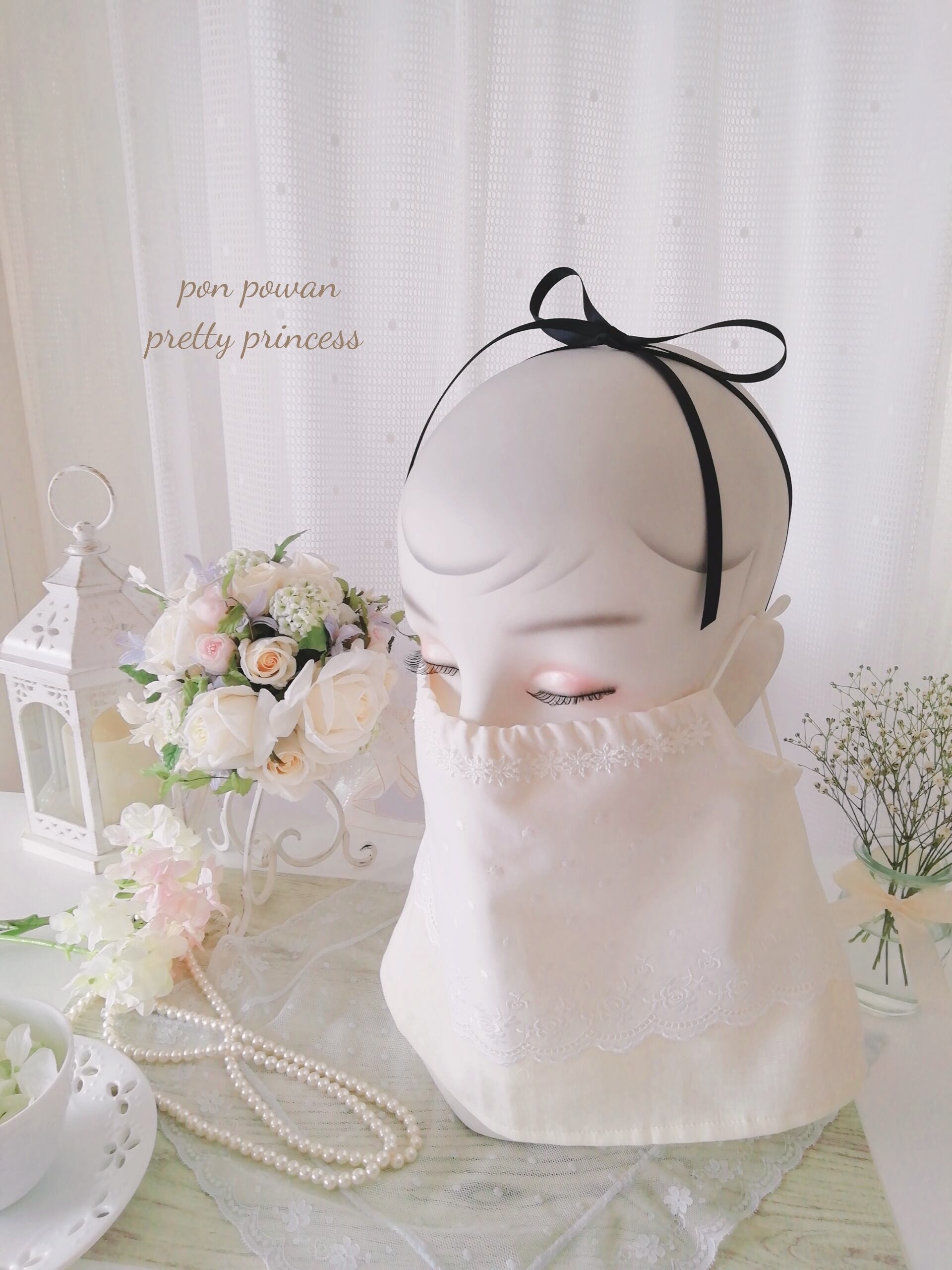 【美人ベールマスク】カラーNo.⑤クリーム×黒リボン♡エレガントな綿レースの美人ベールマスク♡ゆれるBlackサテンリボン◎レディースフリーサイズ