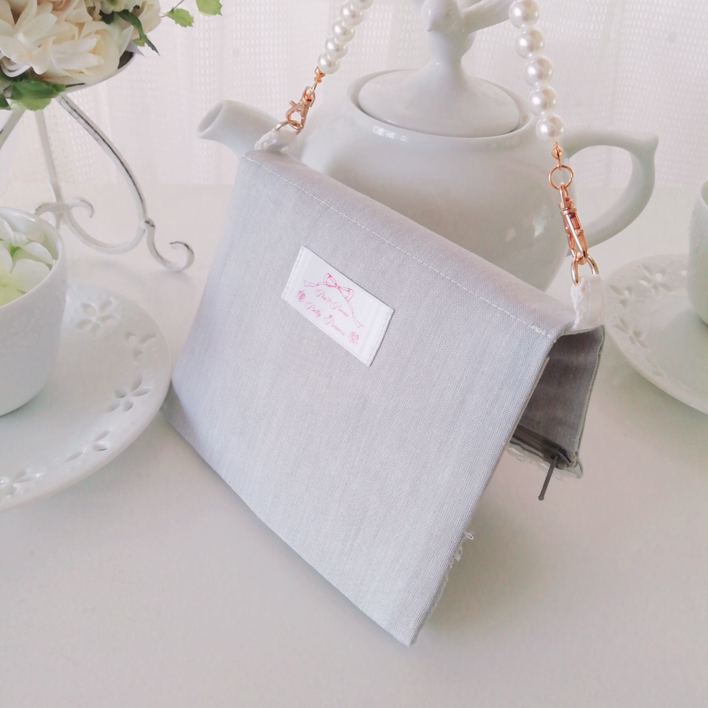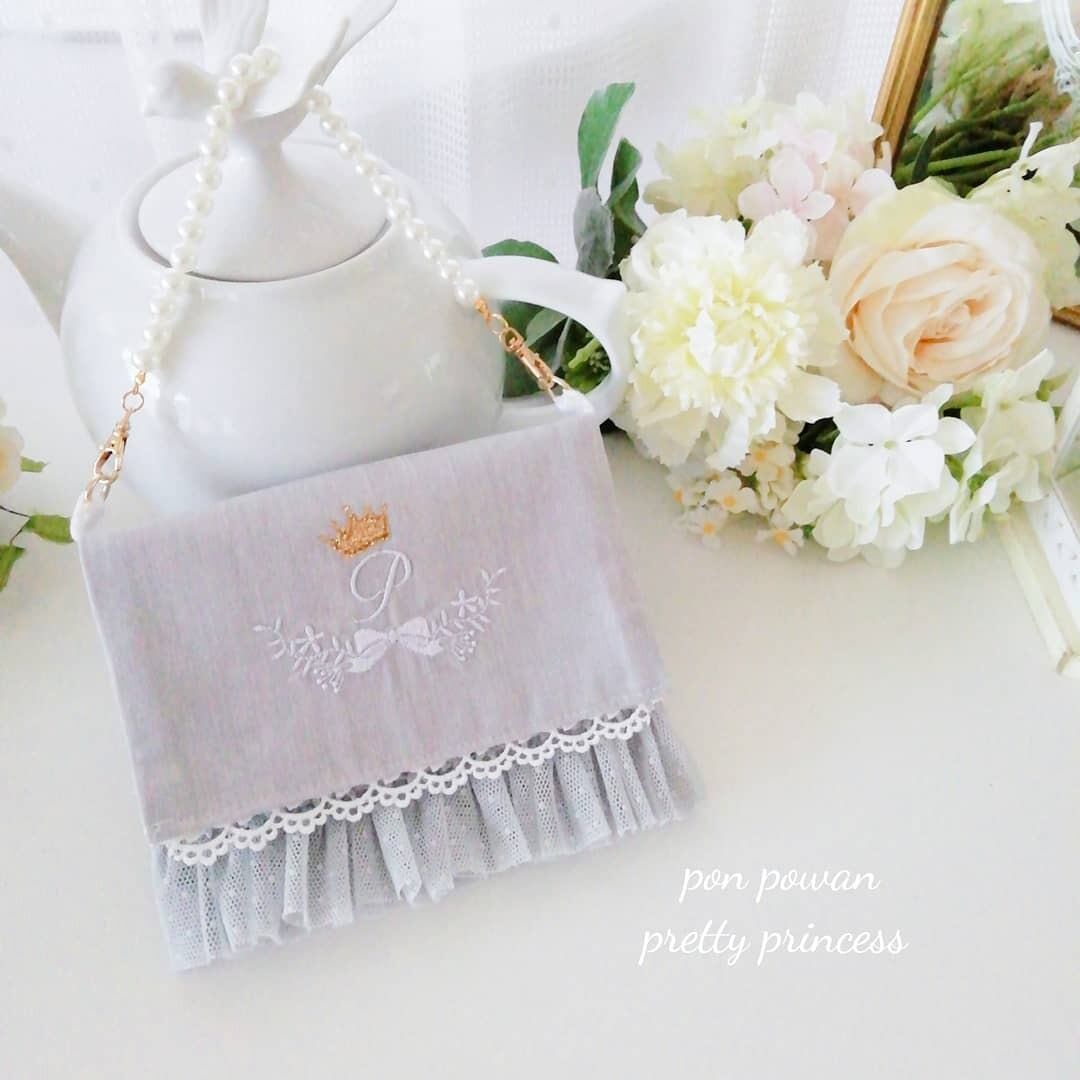 【ロゴ刺繍princessミニポーチ(小物入れ、マスクケース・マクス仮置き、ジュエリーポーチなど)】無地…グレー