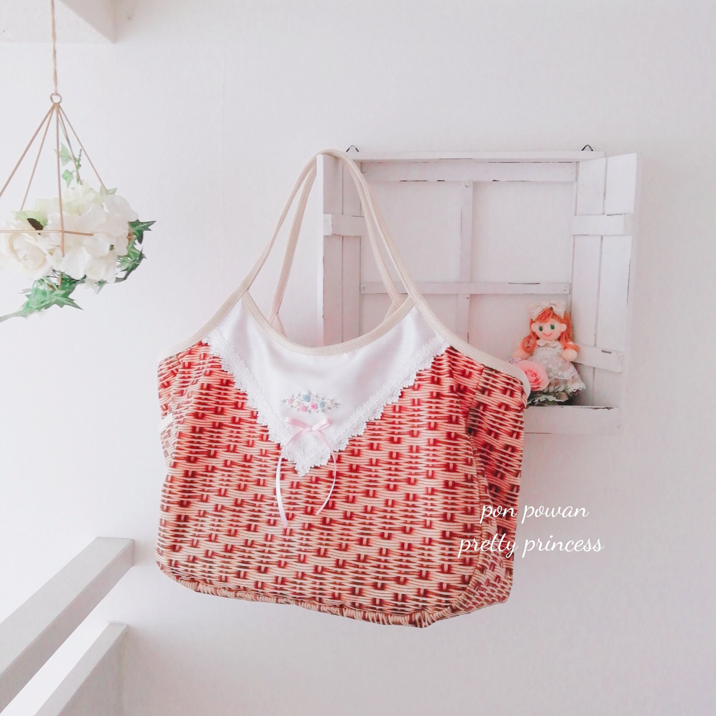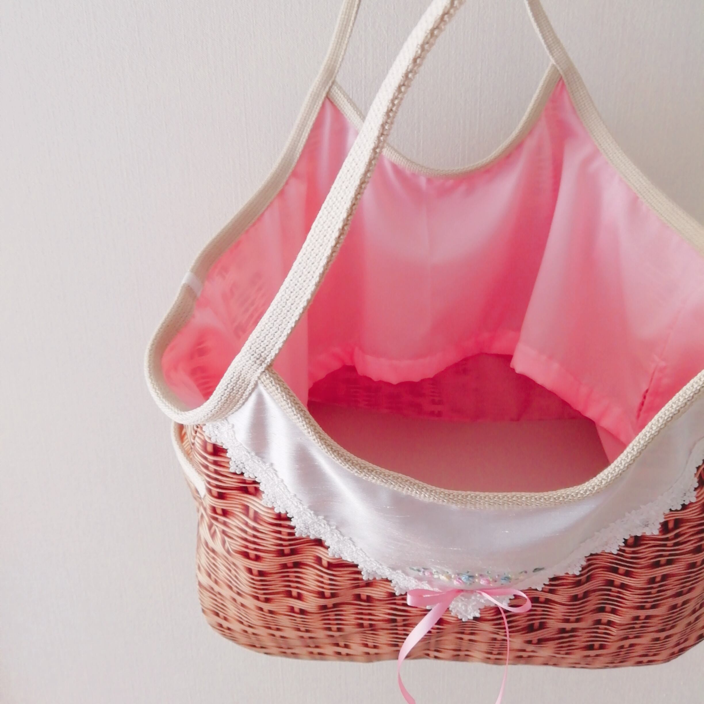 ★ご予約受注販売★とびきりcuteな『グラニーバッグ♡』リアルなバスケットプリント 撥水加工生地 ピンク(エコバッグ✽マザーバッグ✽レジカゴバッグ✽お着替えバッグ…便利なバッグ♡)