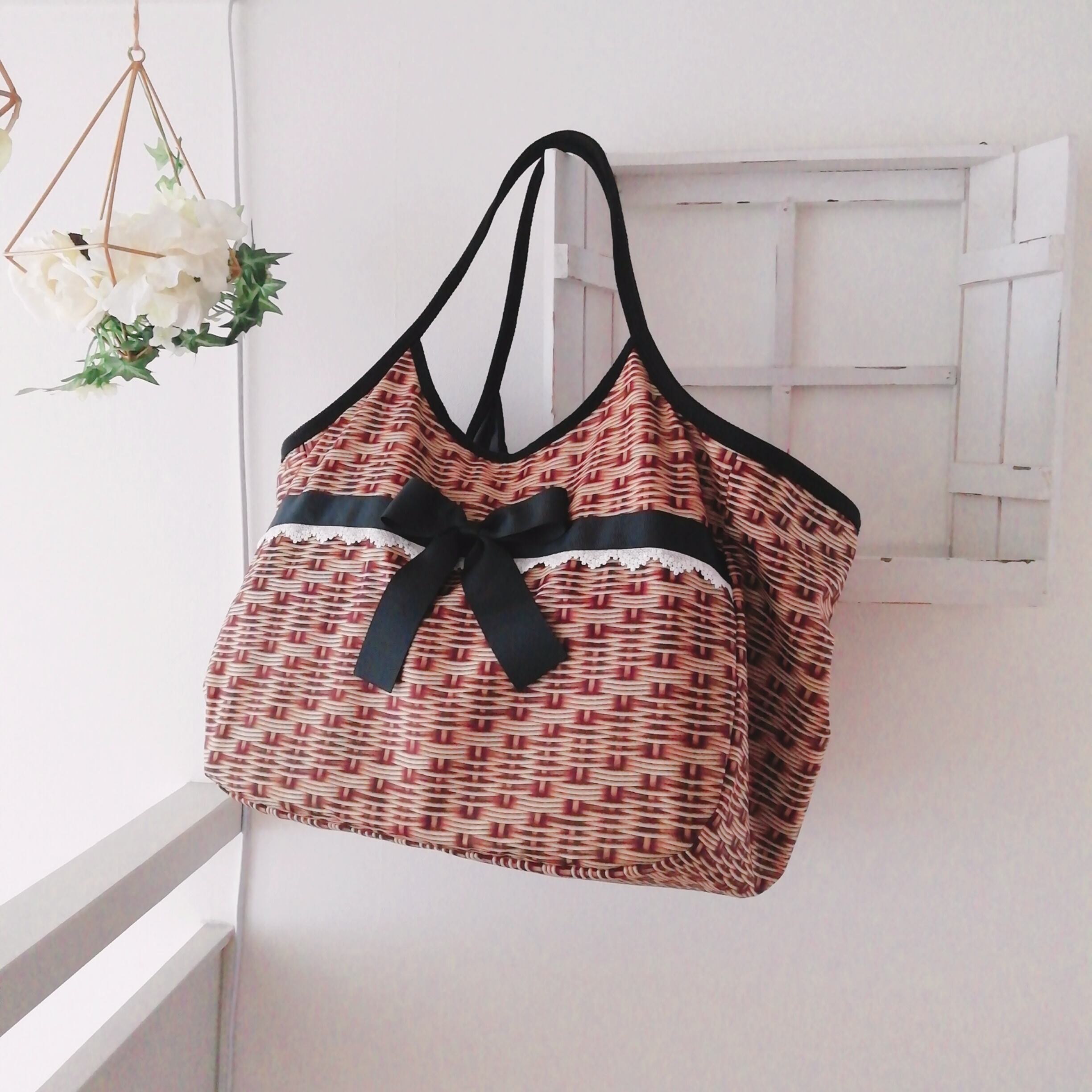 ★ご予約受注販売★エレガントで大人可愛い『グラニーバッグ♡』取り外し出来るリボン1つ付き♪リアルなバスケットプリント 撥水加工生地 Black(エコバッグ✽マザーバッグ✽レジカゴバッグ✽お着替えバッグ…便利なバッグ♡)