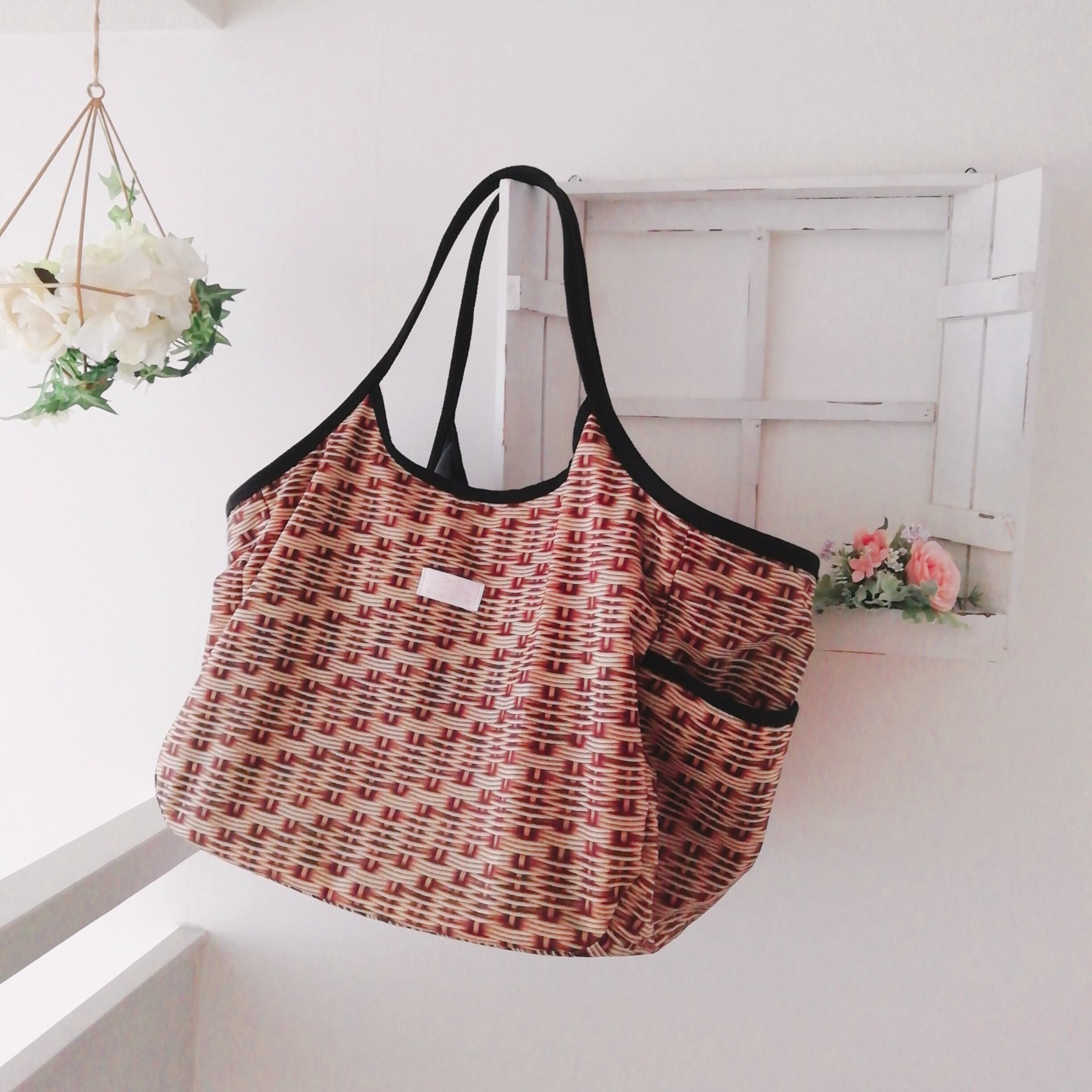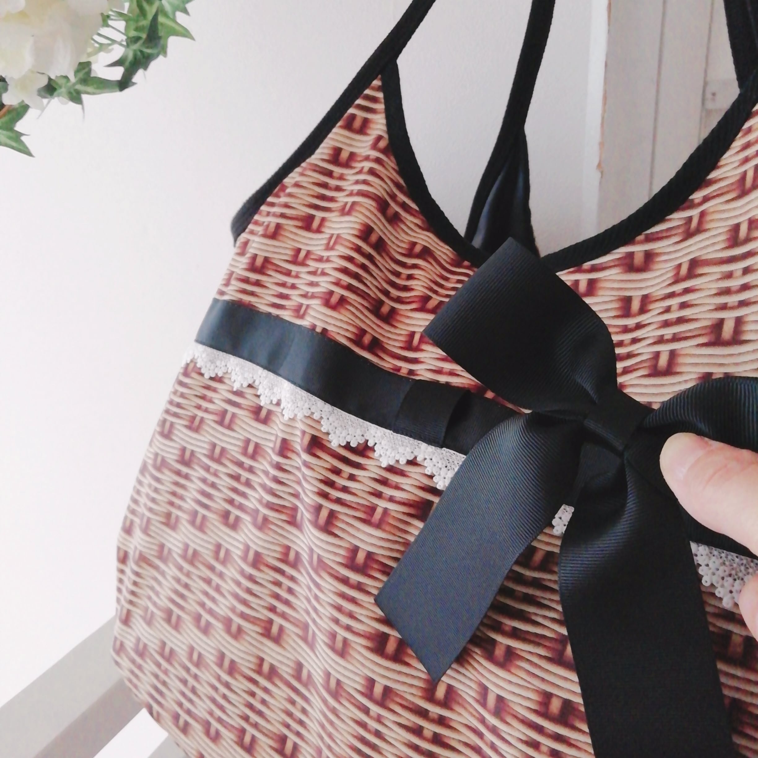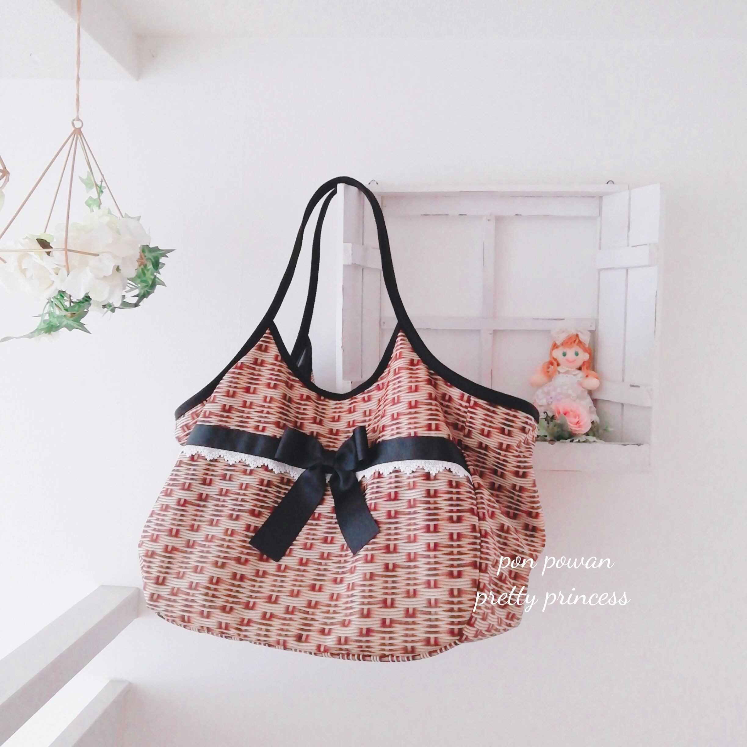 ✳︎再販✳︎エレガントで大人可愛い『グラニーバッグ♡』取り外し出来るリボン1つ付き♪リアルなバスケットプリント 撥水加工生地 Black(エコバッグ✽マザーバッグ✽レジカゴバッグ✽お着替えバッグ…便利なバッグ♡)