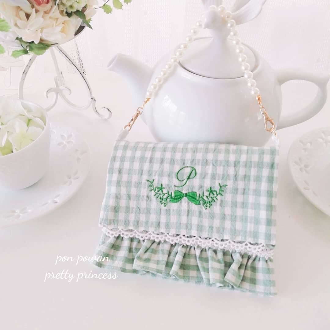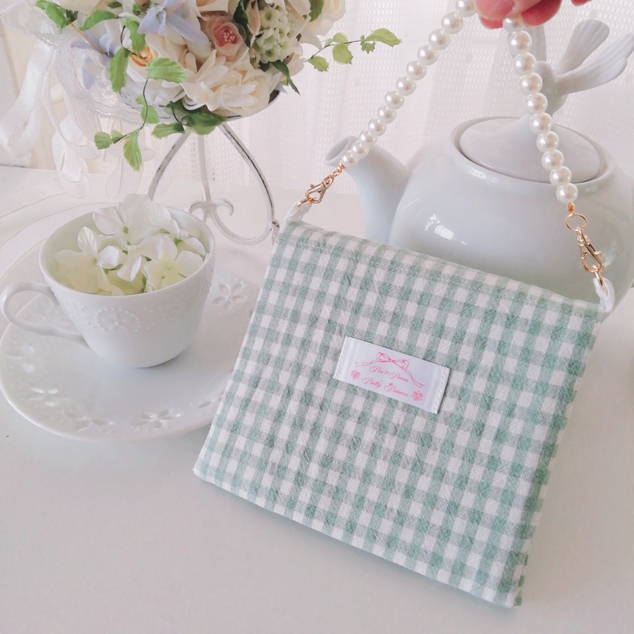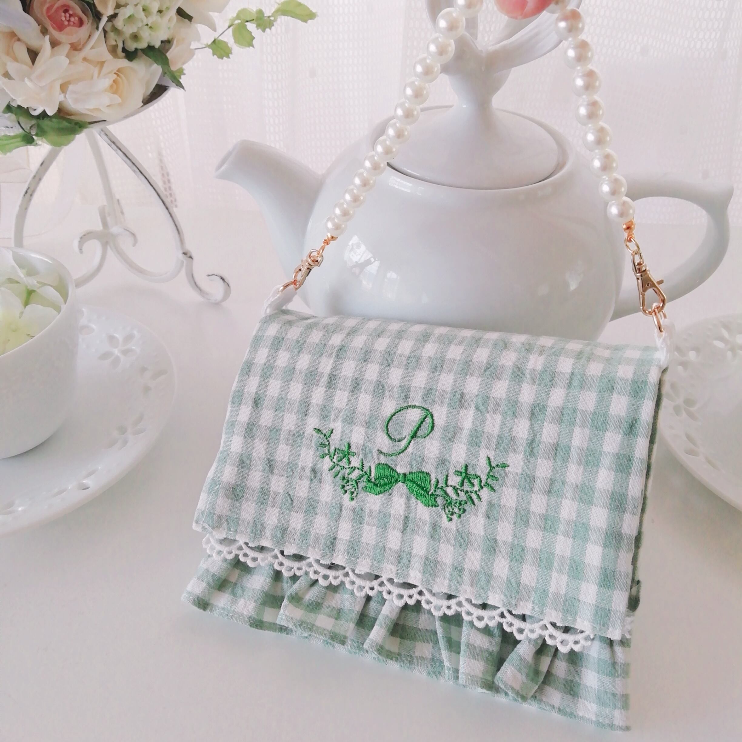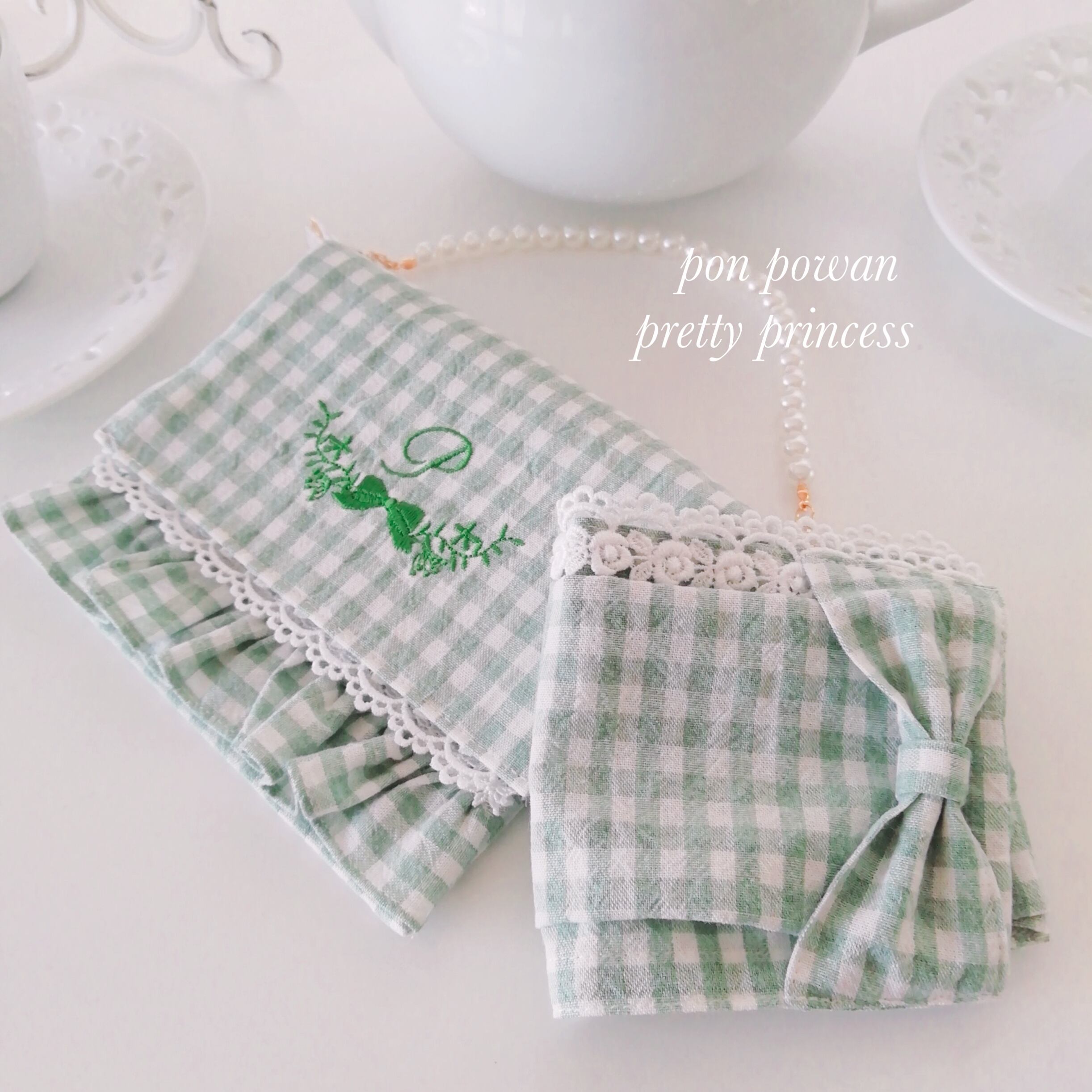✳︎エレガントな刺繍入りミニポーチ&リボン付き不織布マスクカバー ✳︎小物入れ✳︎マスクケースマクス仮置き✳︎ジュエリーポーチ◎ギンガムチェック◎グリーン
