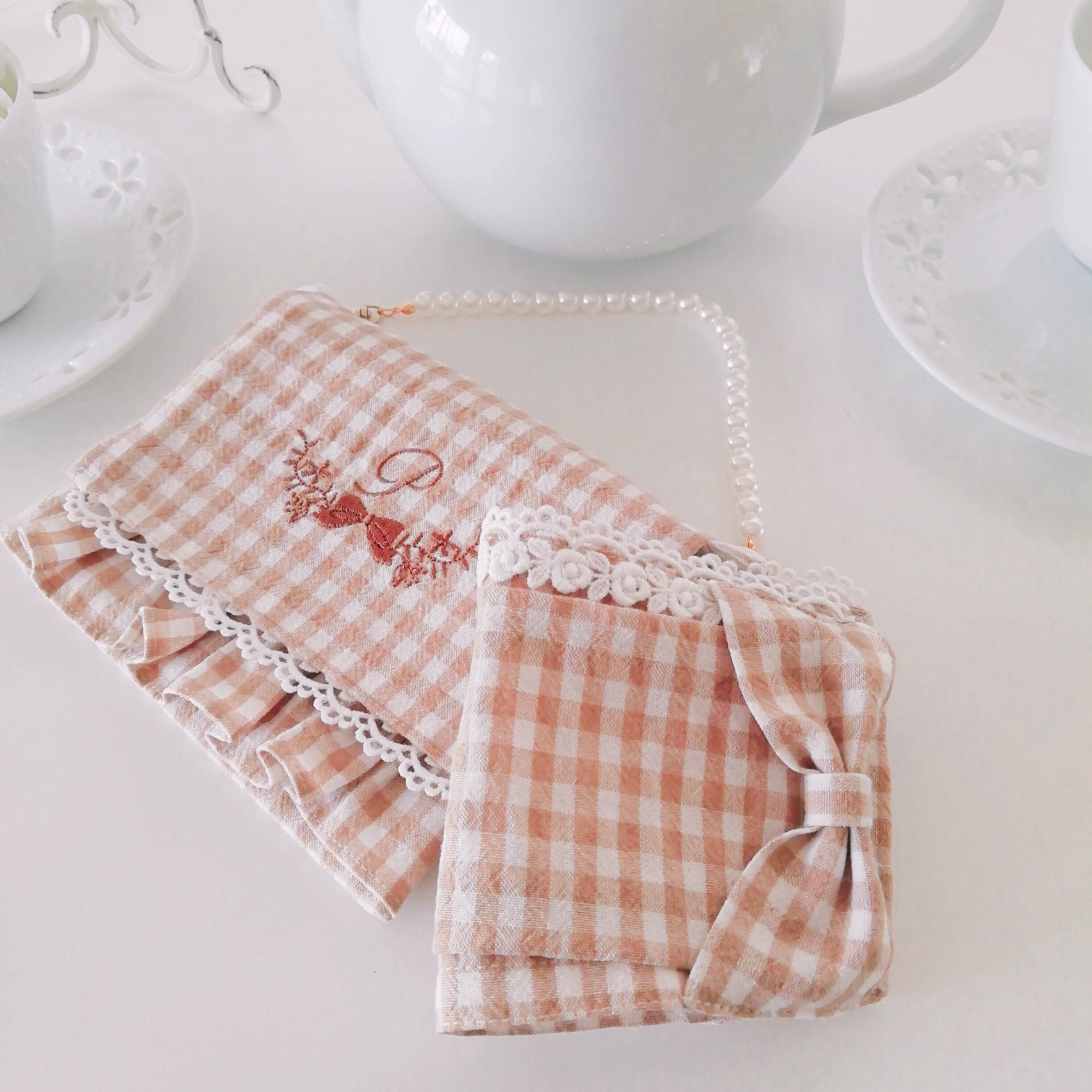 ✳︎エレガントな刺繍入りミニポーチ&リボン付き不織布マスクカバー ✳︎小物入れ✳︎マスクケースマクス仮置き✳︎ジュエリーポーチ◎ギンガムチェック◎ベージュ