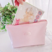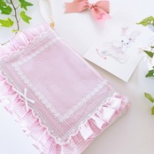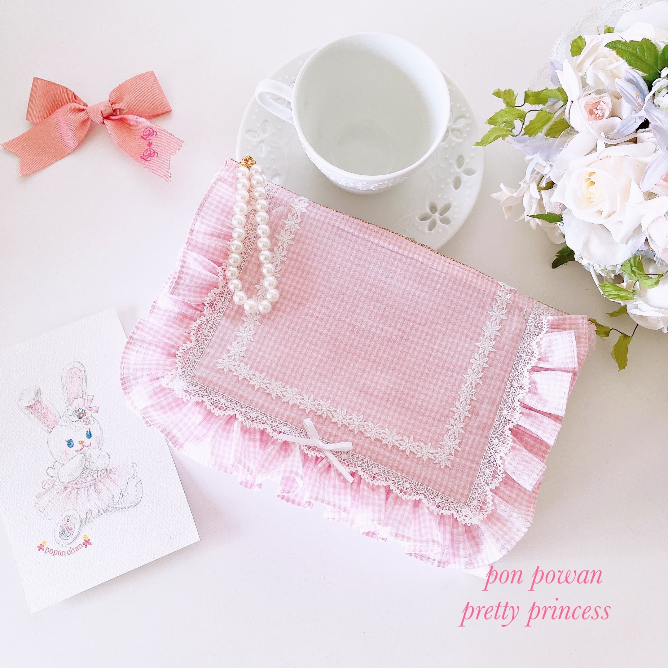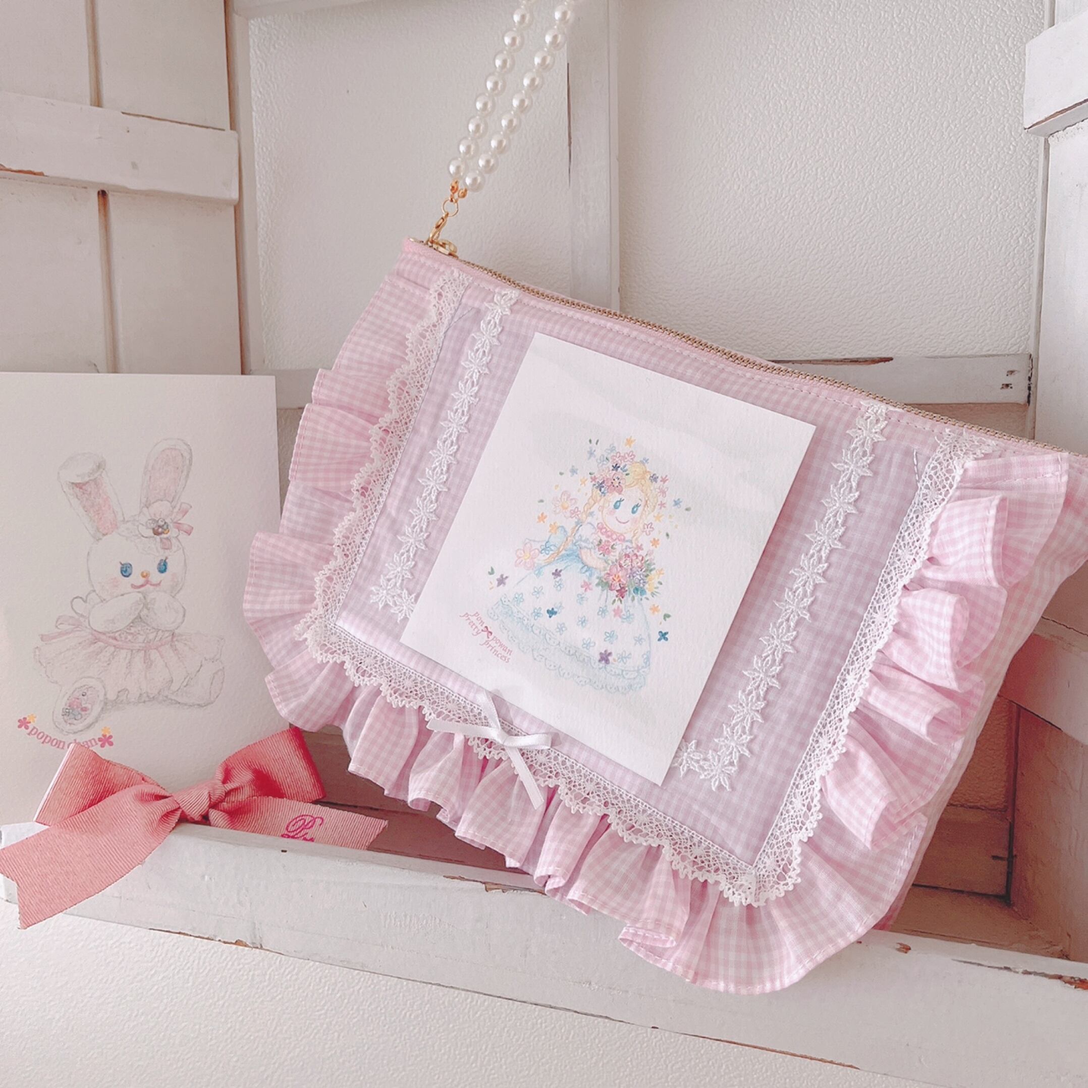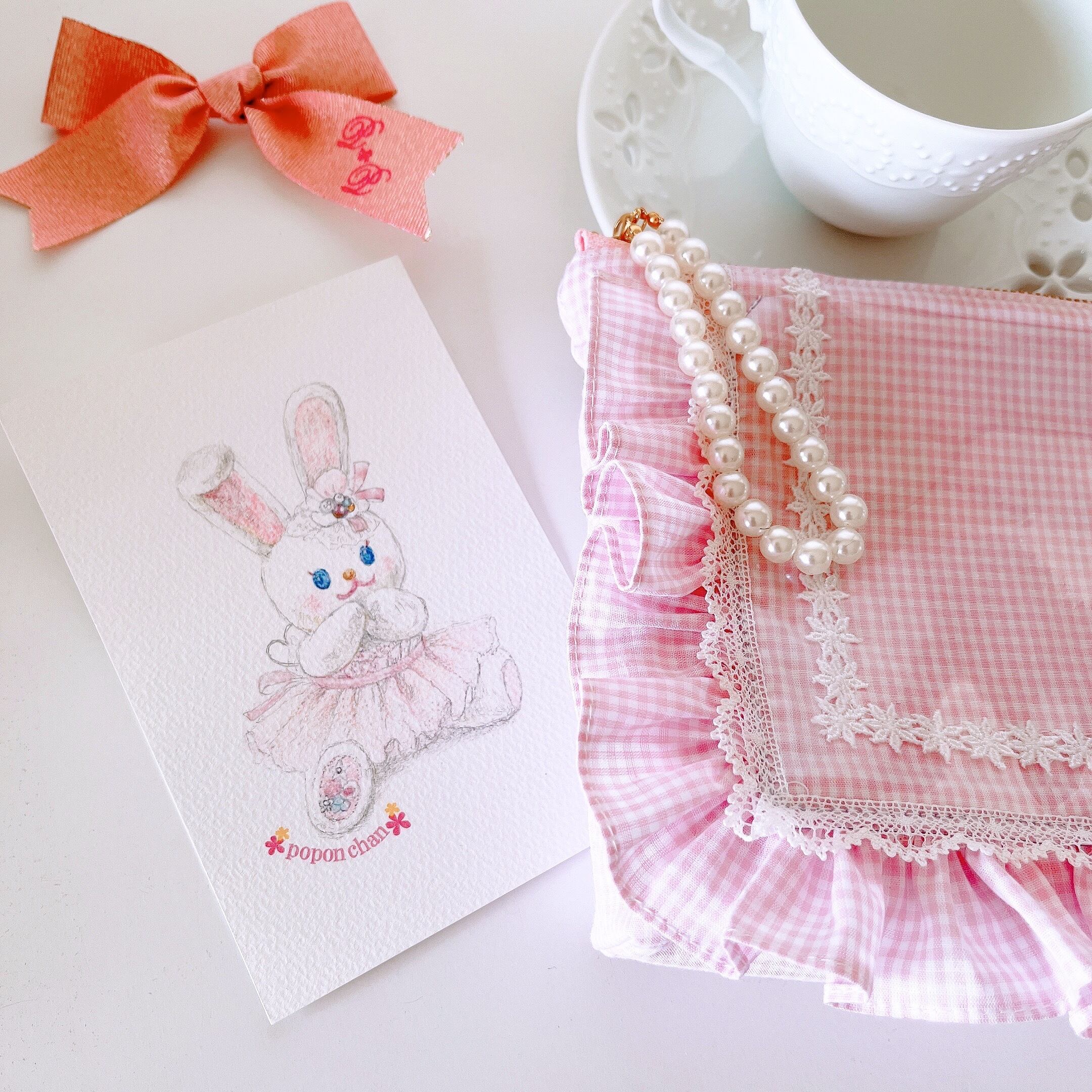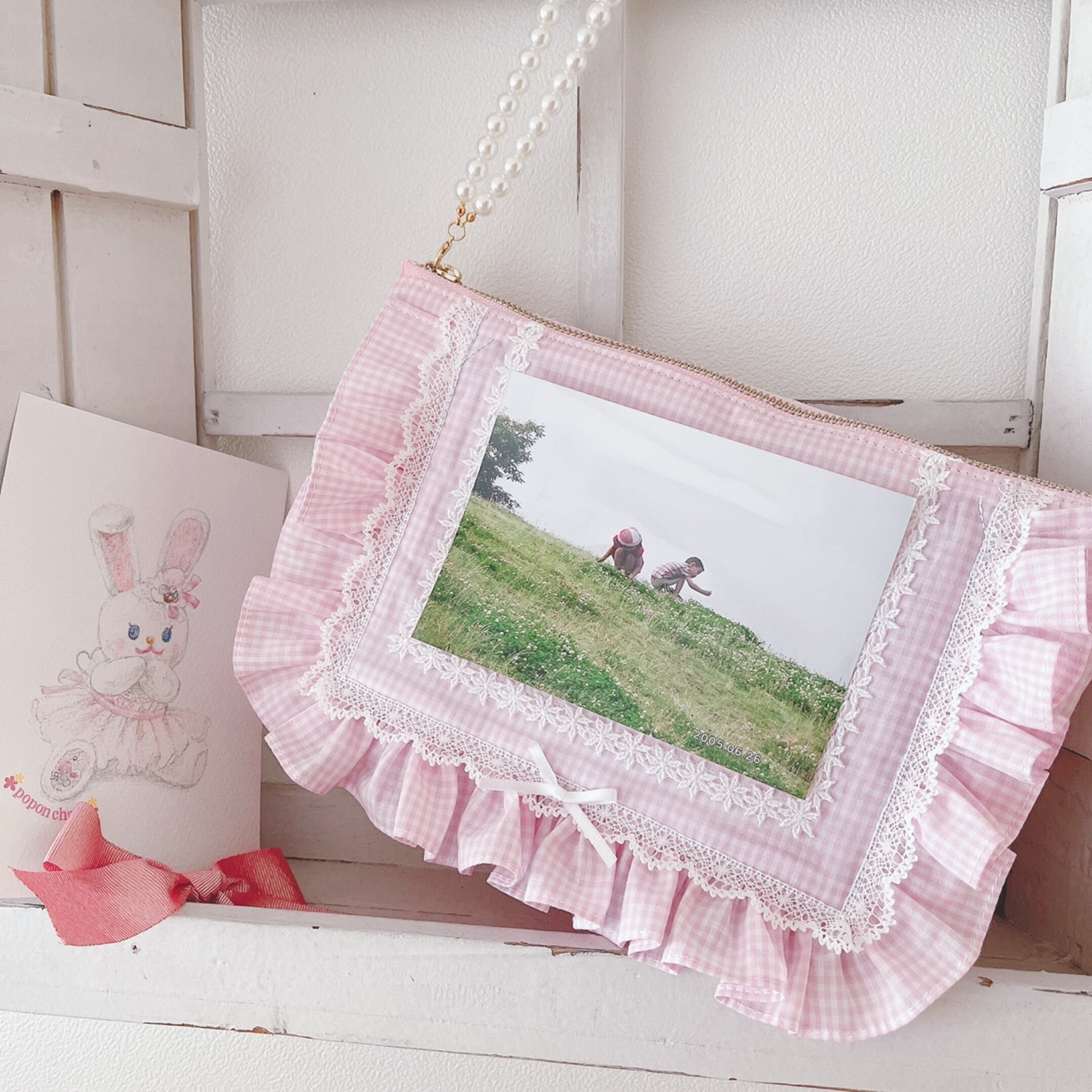✳︎ギンガムチェックピンク♡お気に入りのポストカードや♡写真を入れて♡いつでも一緒♡パールの持ち手付きフリル フレームポーチ❤︎