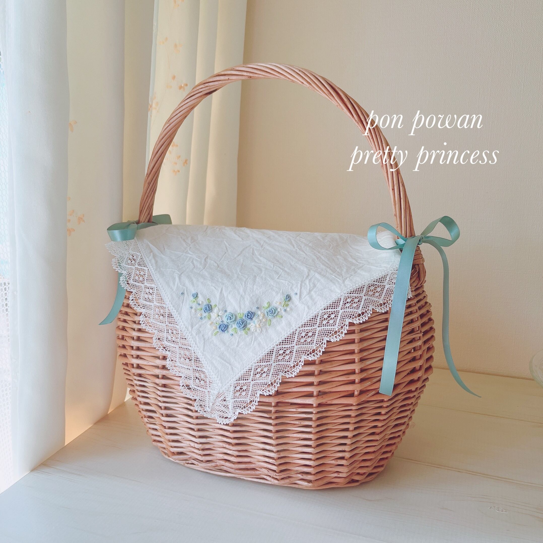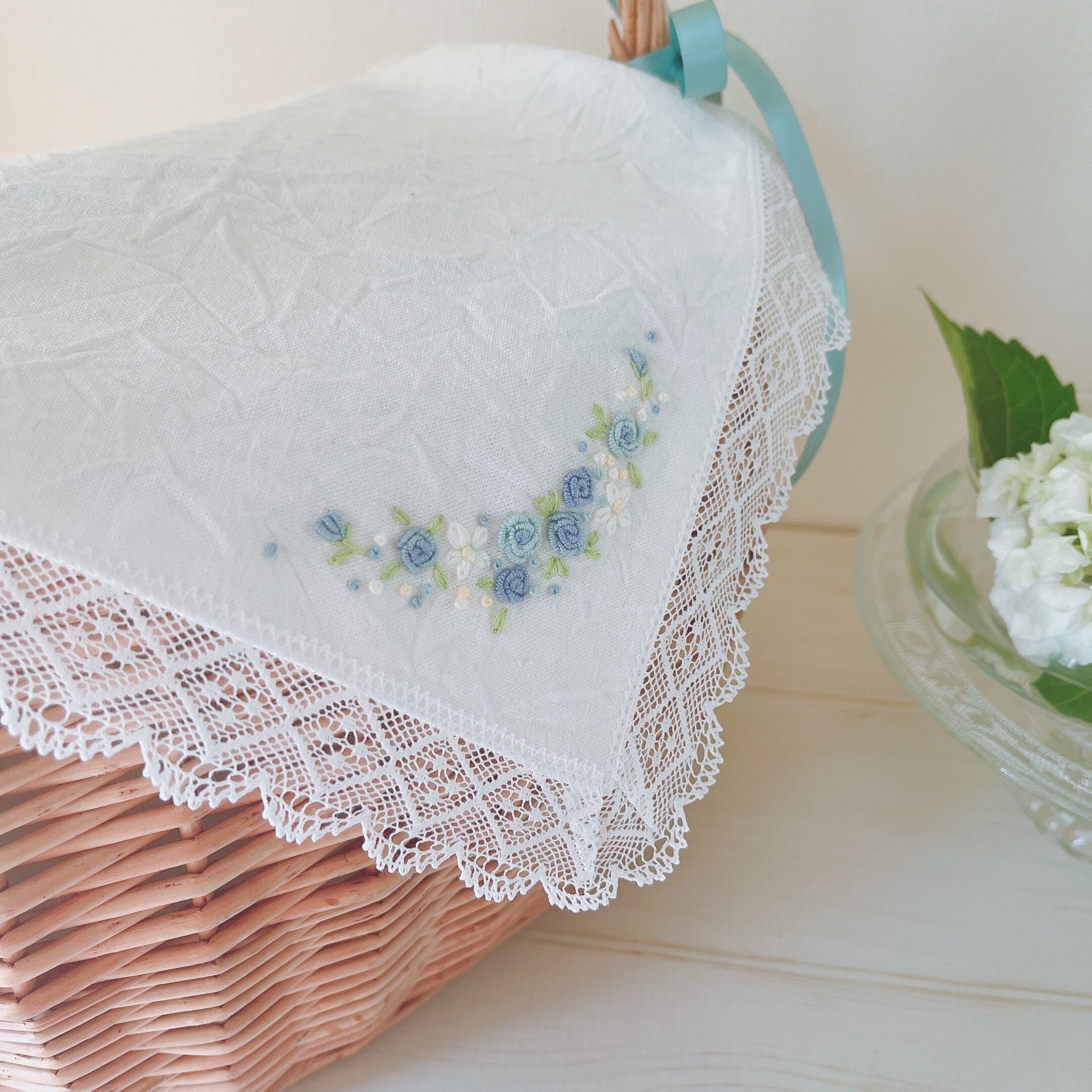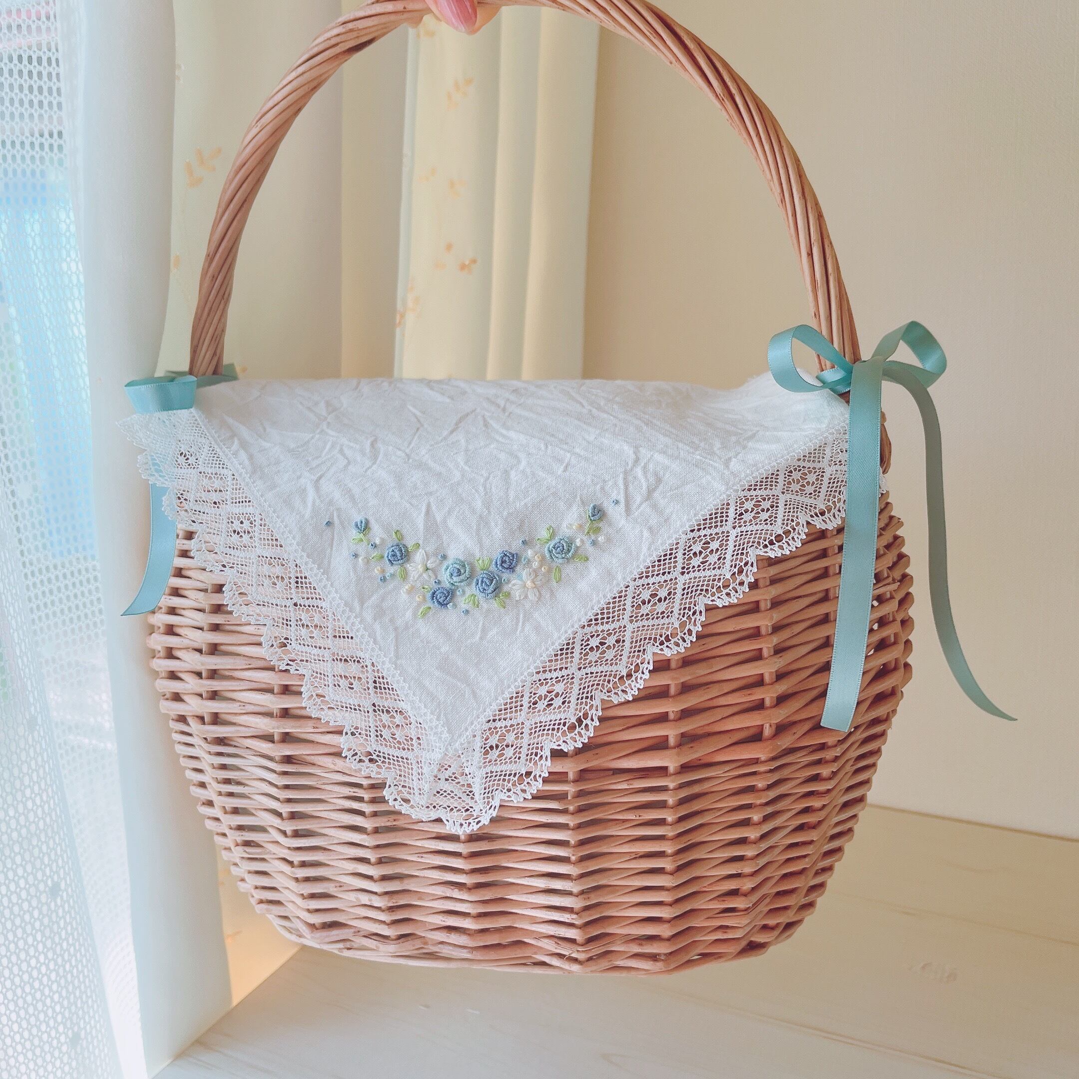 大人可愛いバスケット&おめかしベールカバー♡ 《バッグとカバーの2点セット♡ブルー♡》カゴバッグ♡手刺繍のハンカチカバーで目隠し♡ワンハンドル大人のカゴバッグ
