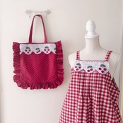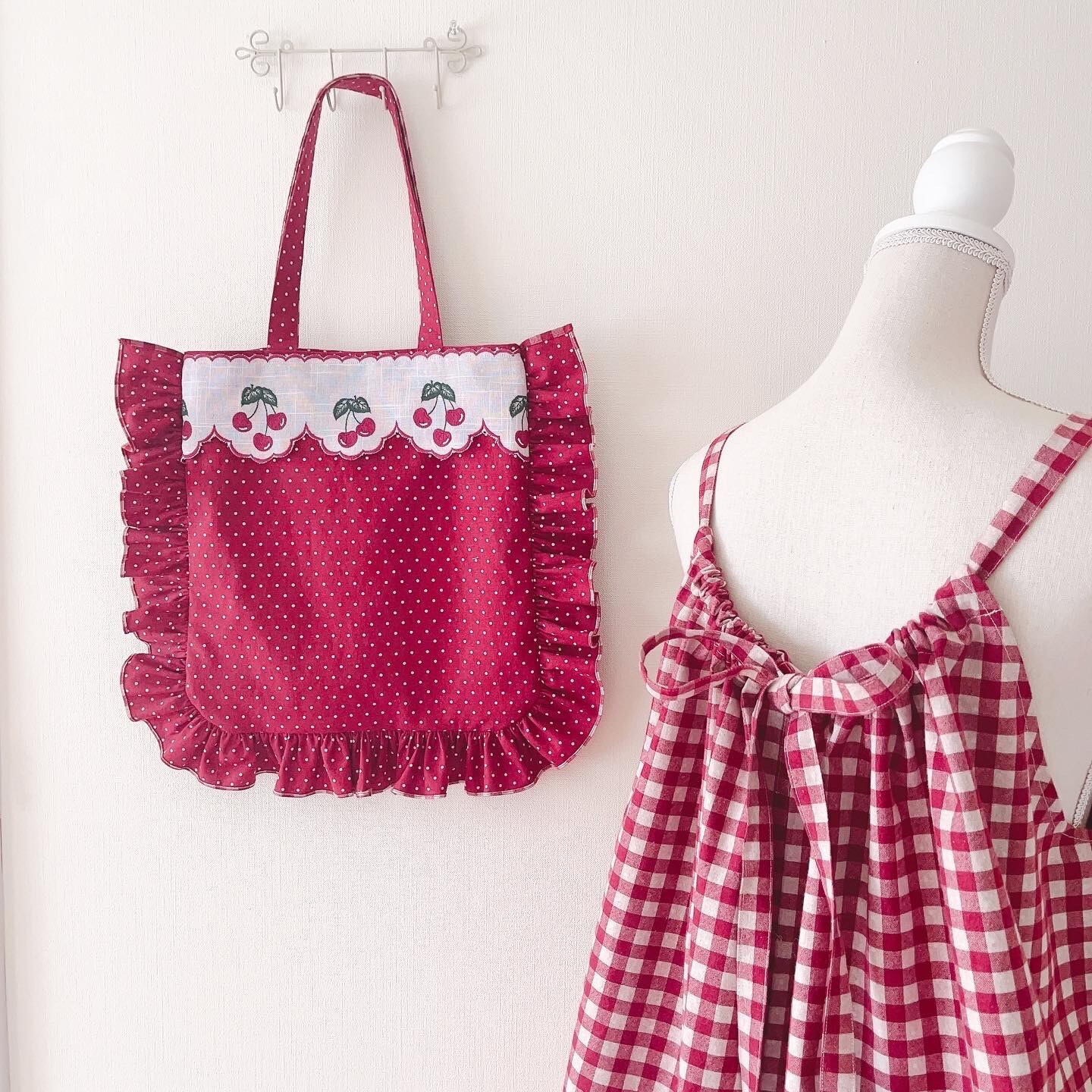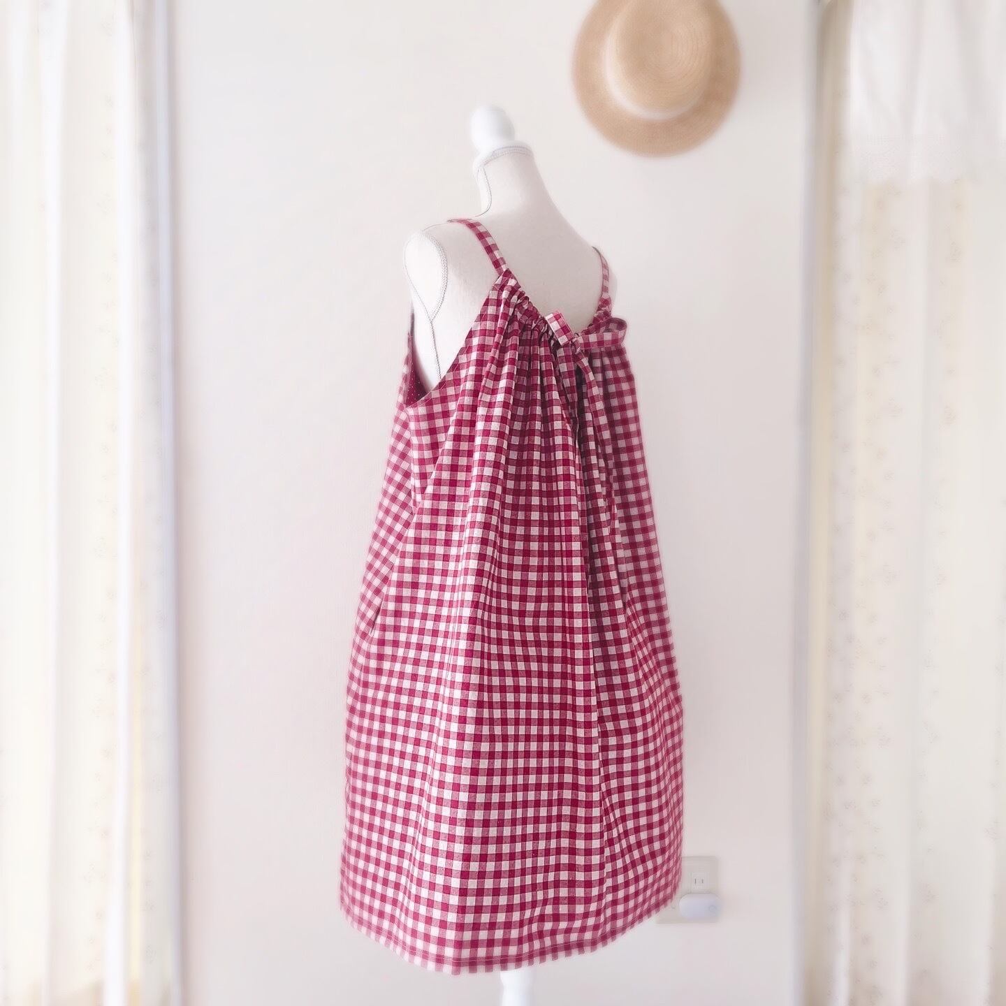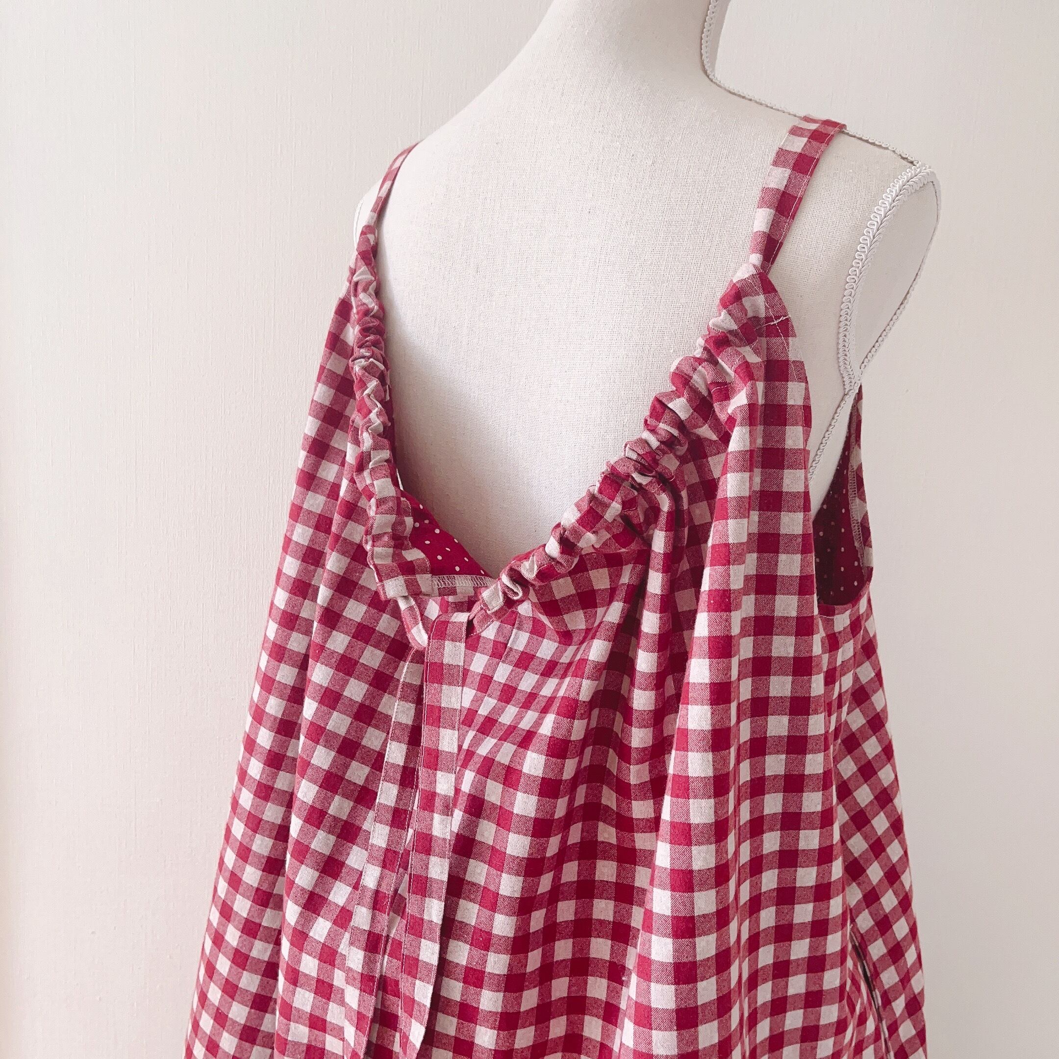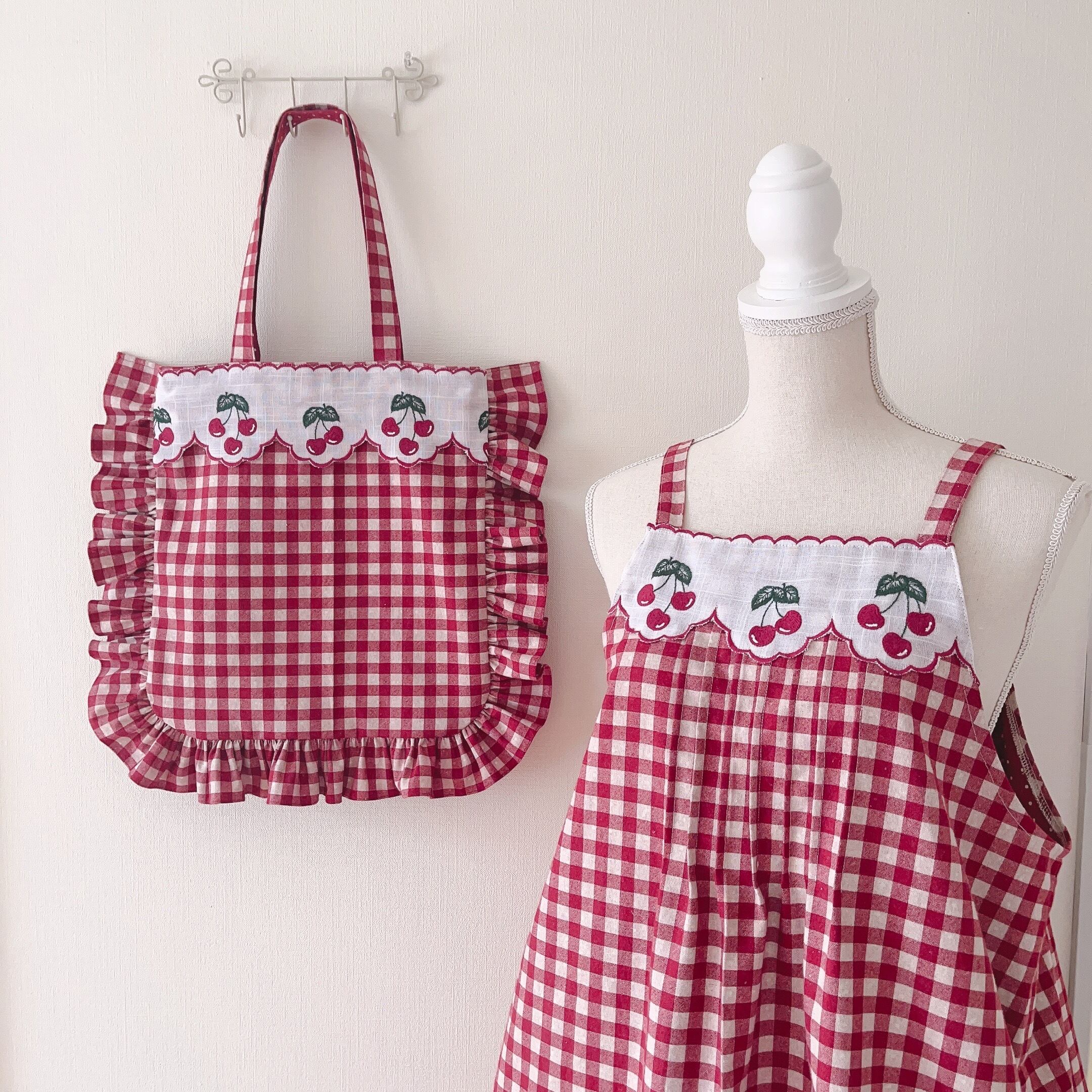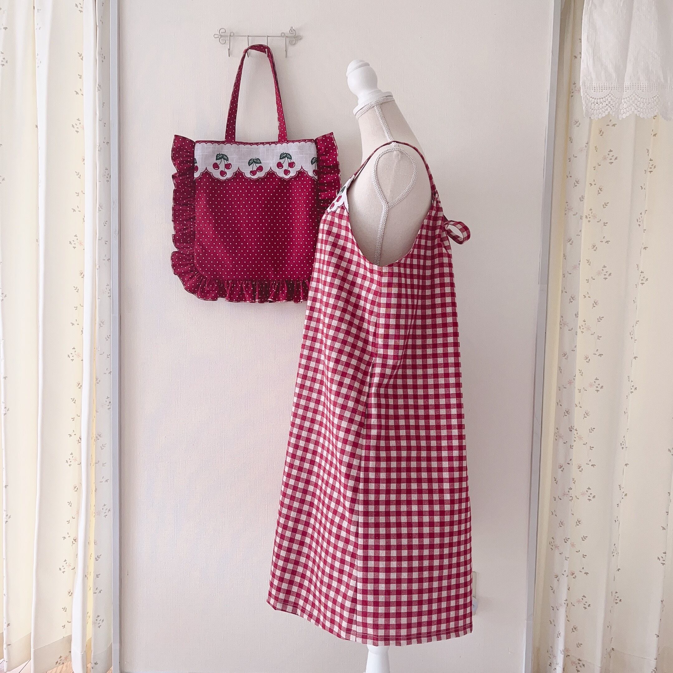 ヨーロッパ製さくらんぼレースを使用♡大人かわいいエプロンワンピース♡後ろ姿も可愛いエプロン♡ギンガムチェックエプロン♡ピンタック入り♡さくらんぼ刺繍入りエプロン♡かわいいエプロンワンピース♡アンティークレッド♡私のエプロン♡特別感を楽しむ♡